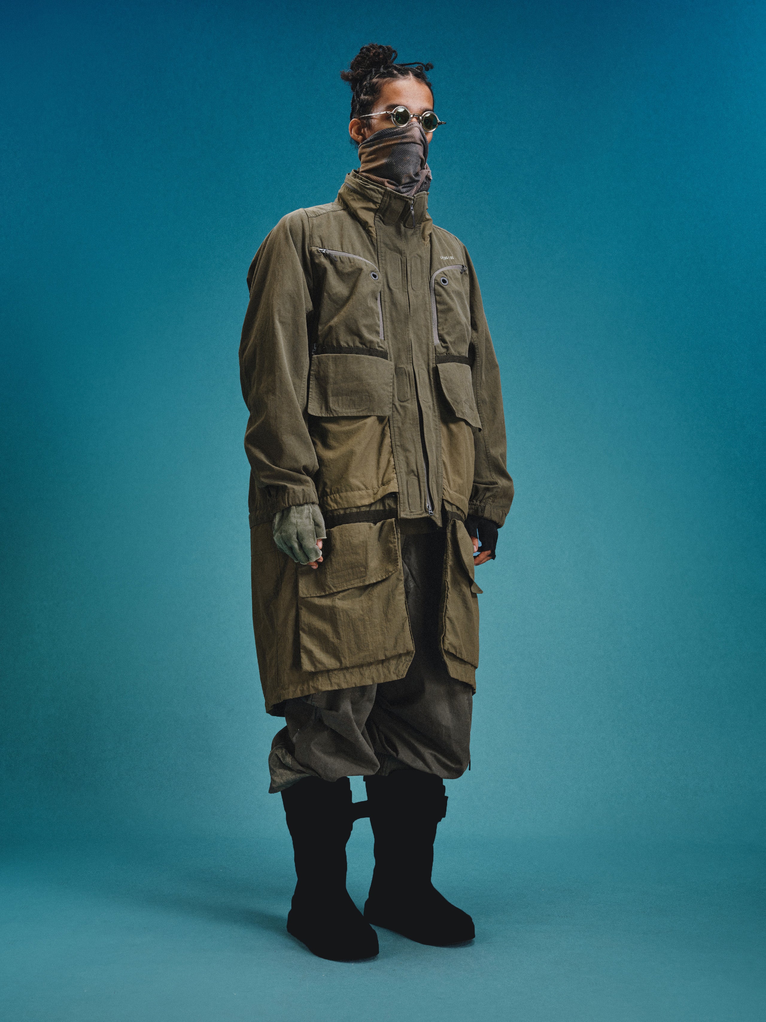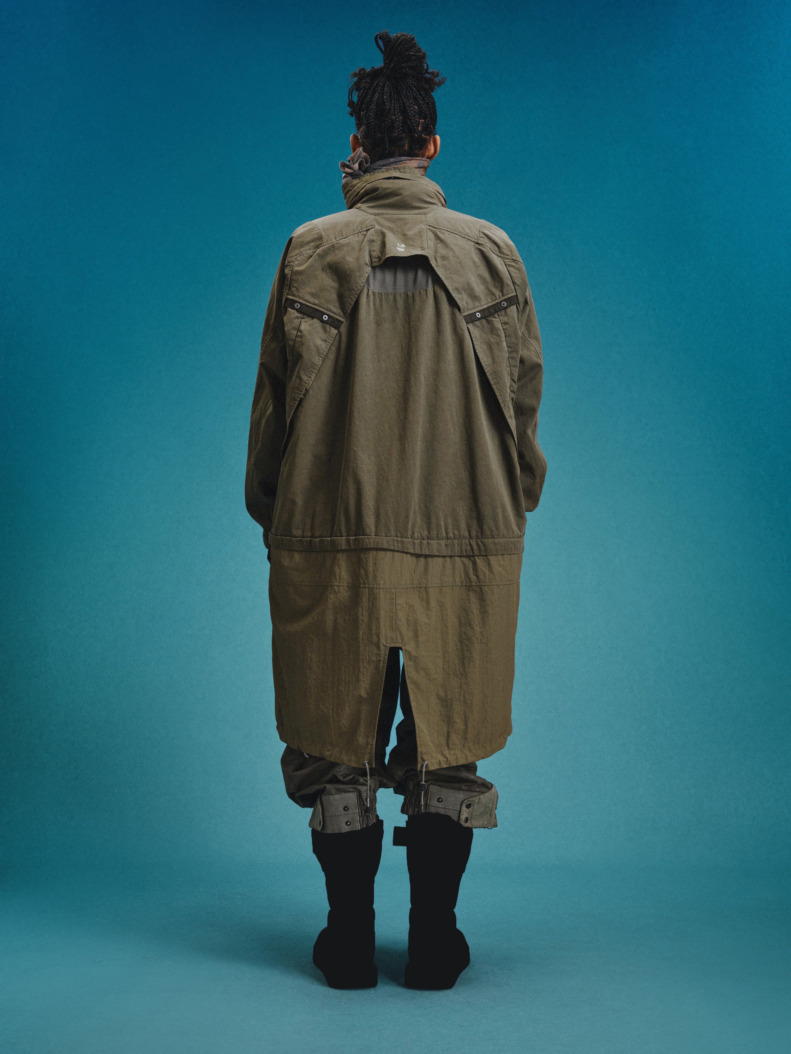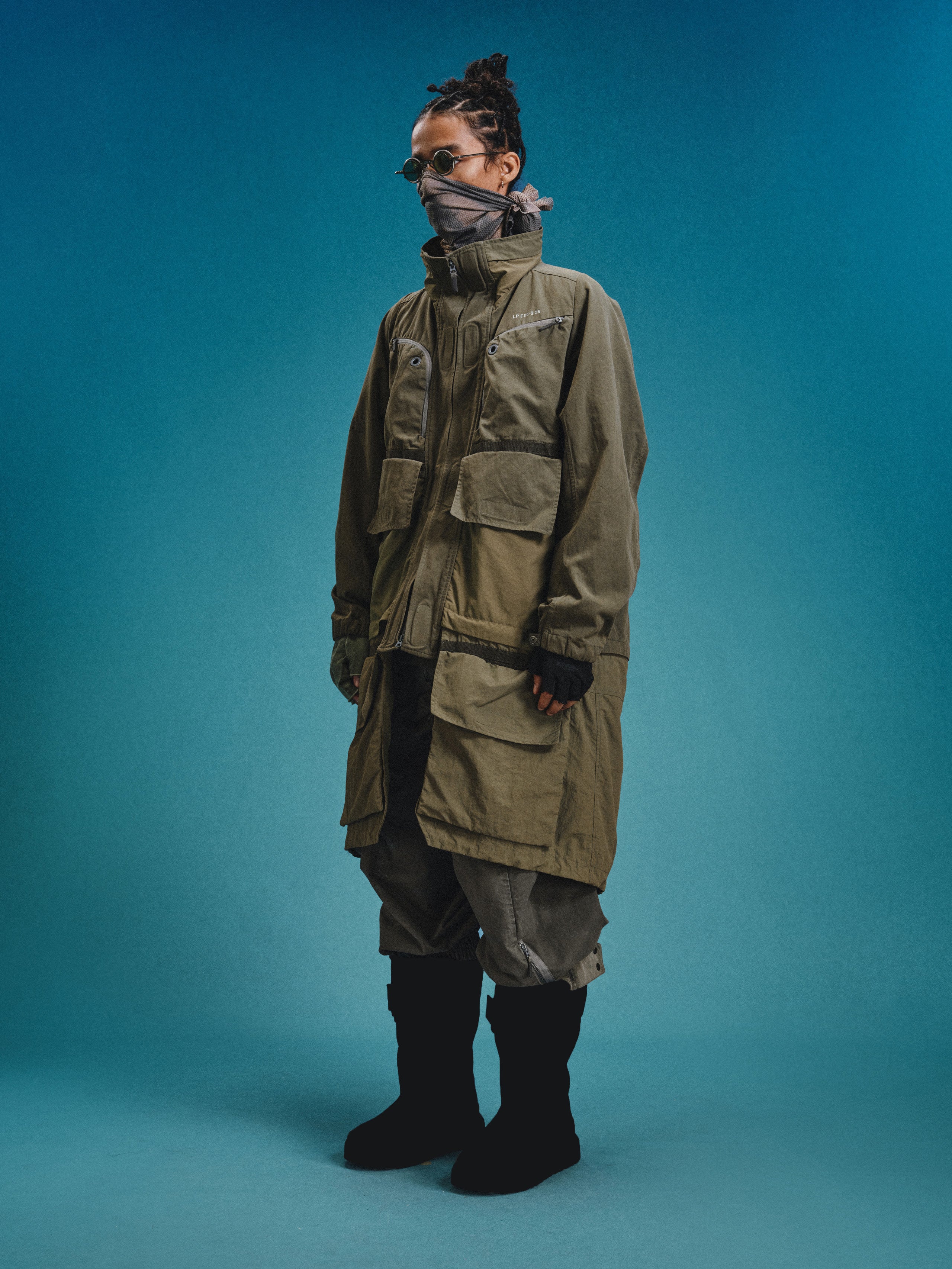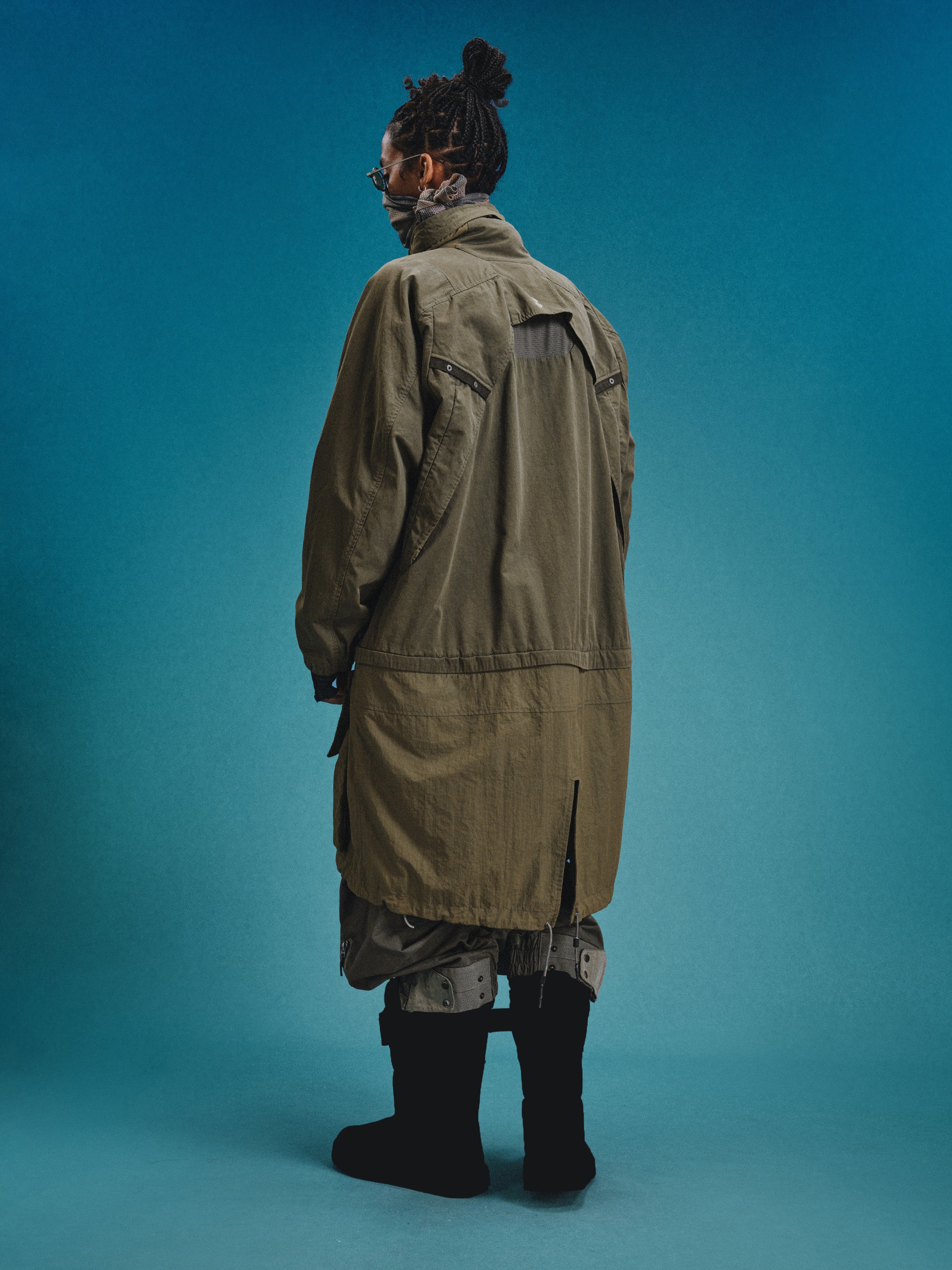 _Dual-module construction, detachable hem workwear coat convertible between cargo jacket and long trench coat.
