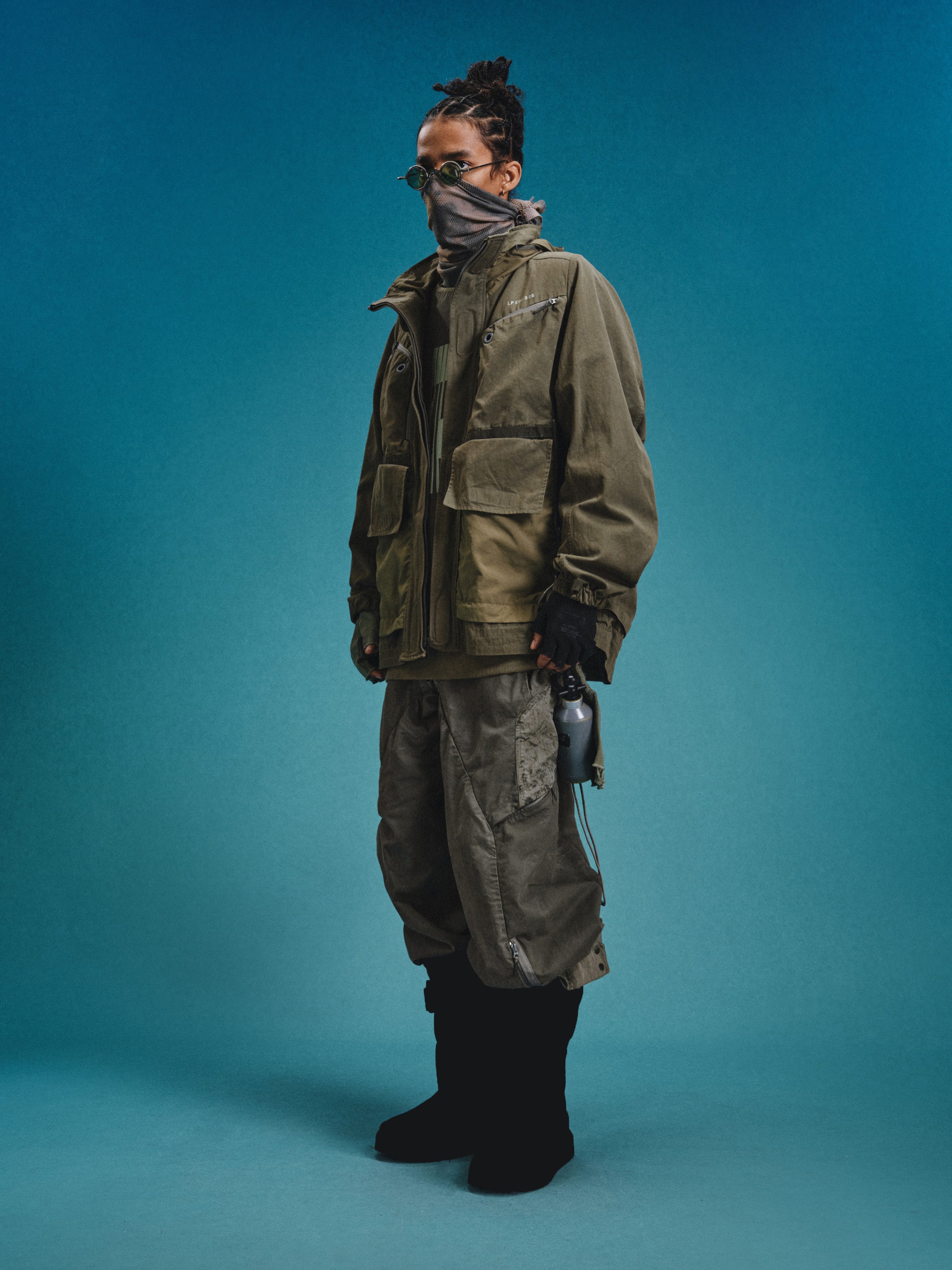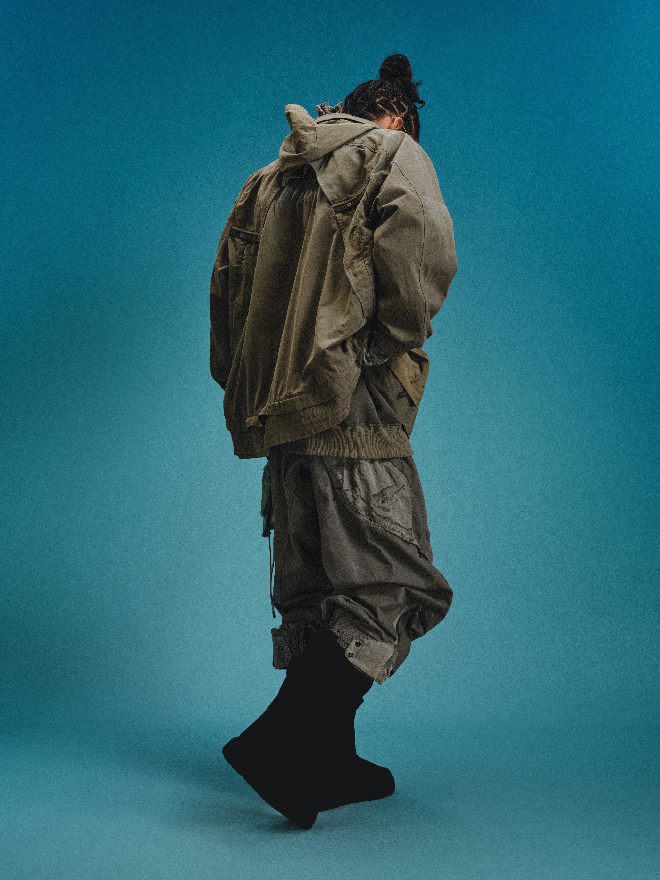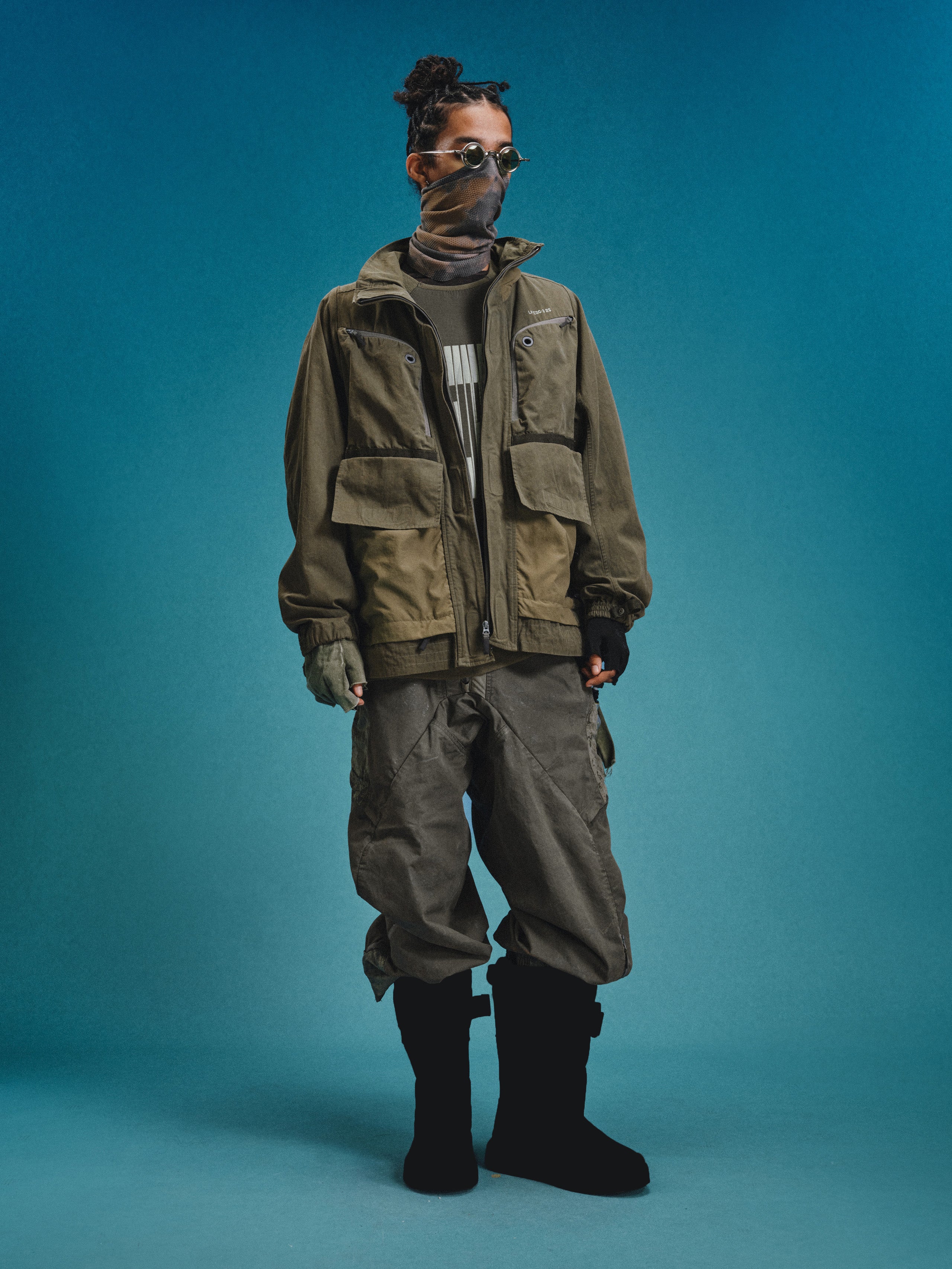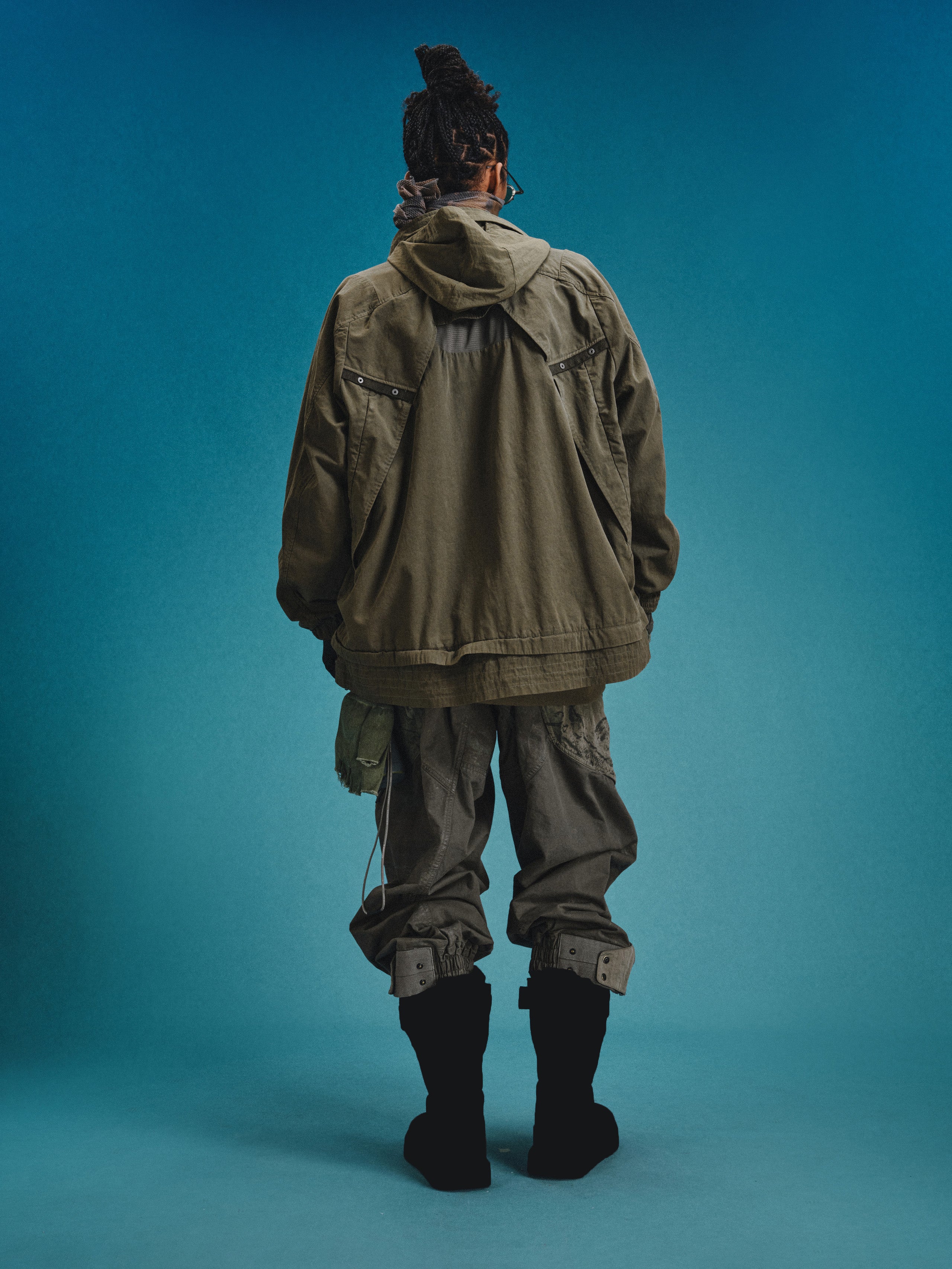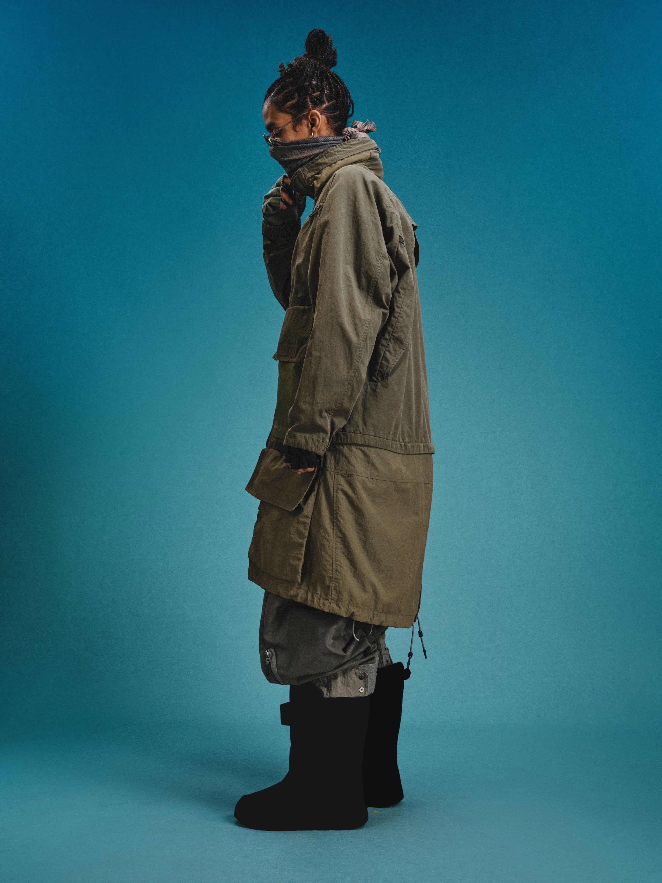 _Dual-module construction, detachable hem workwear coat convertible between cargo jacket and long trench coat.