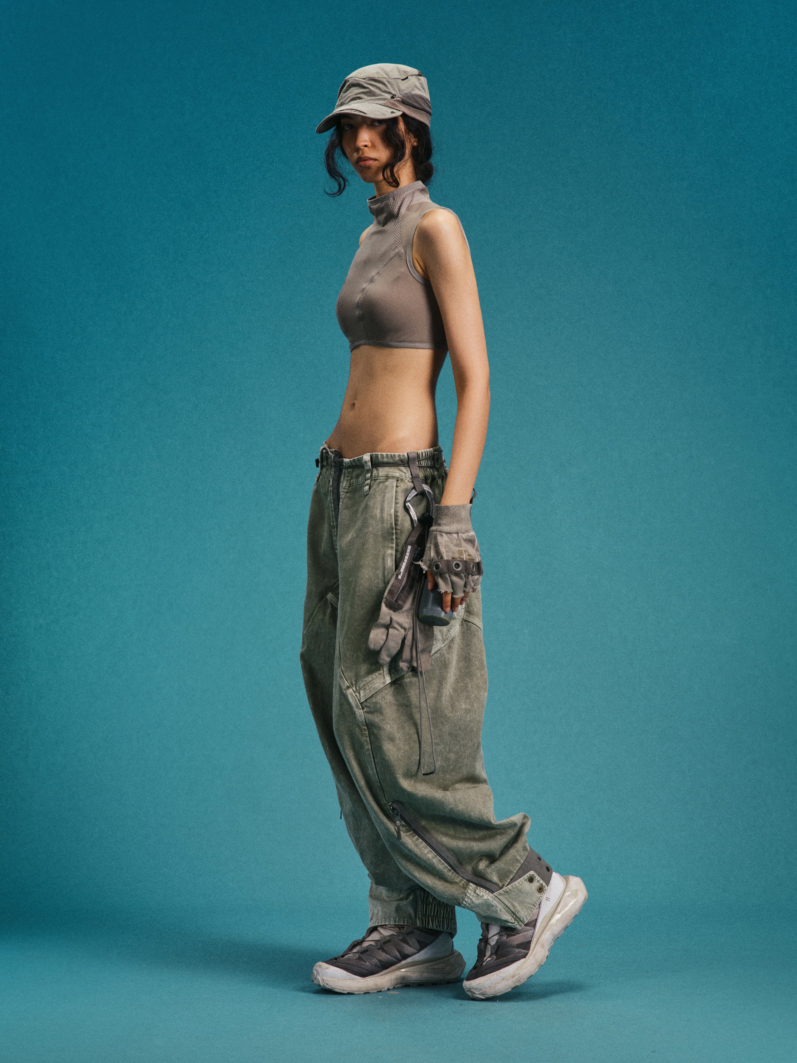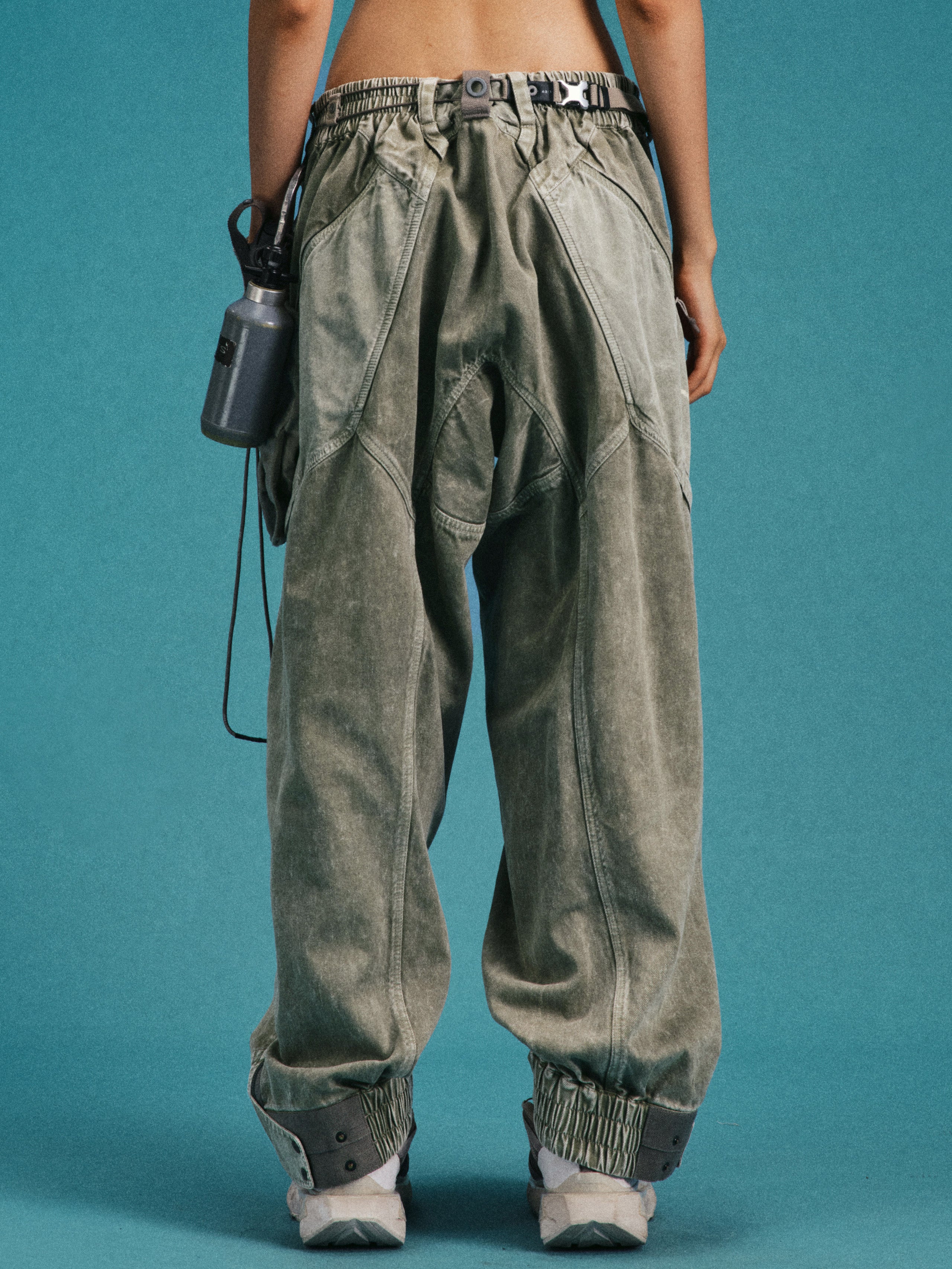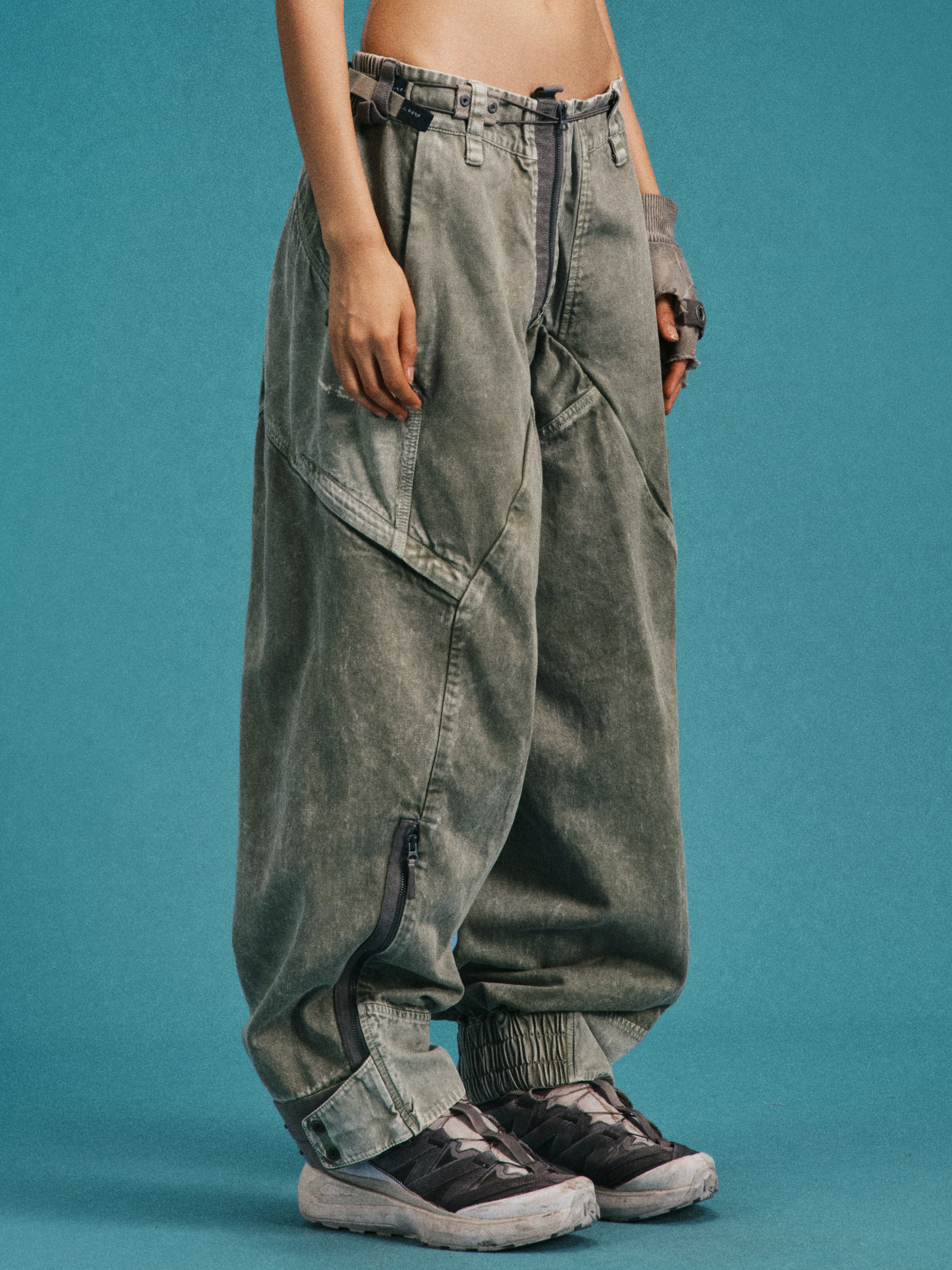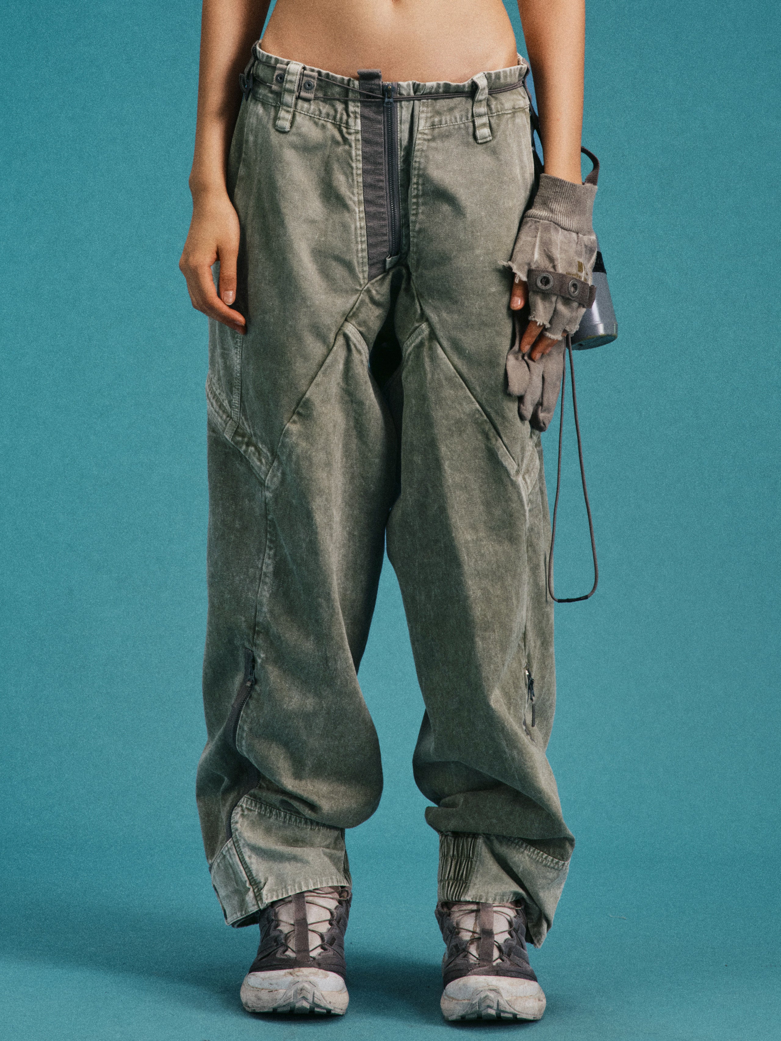 _Horizontal zippered pockets hidden under flaps on the outer thighs.