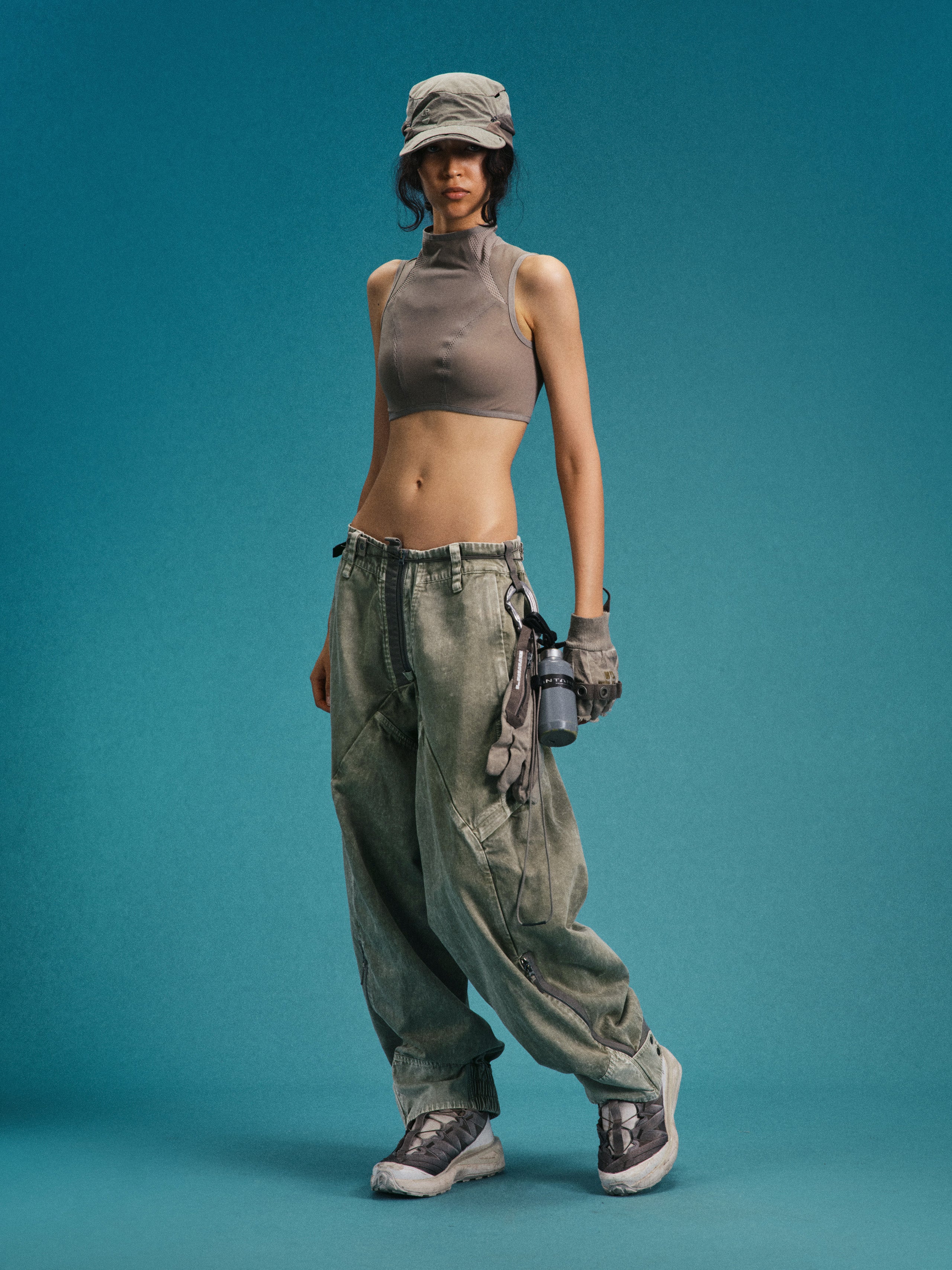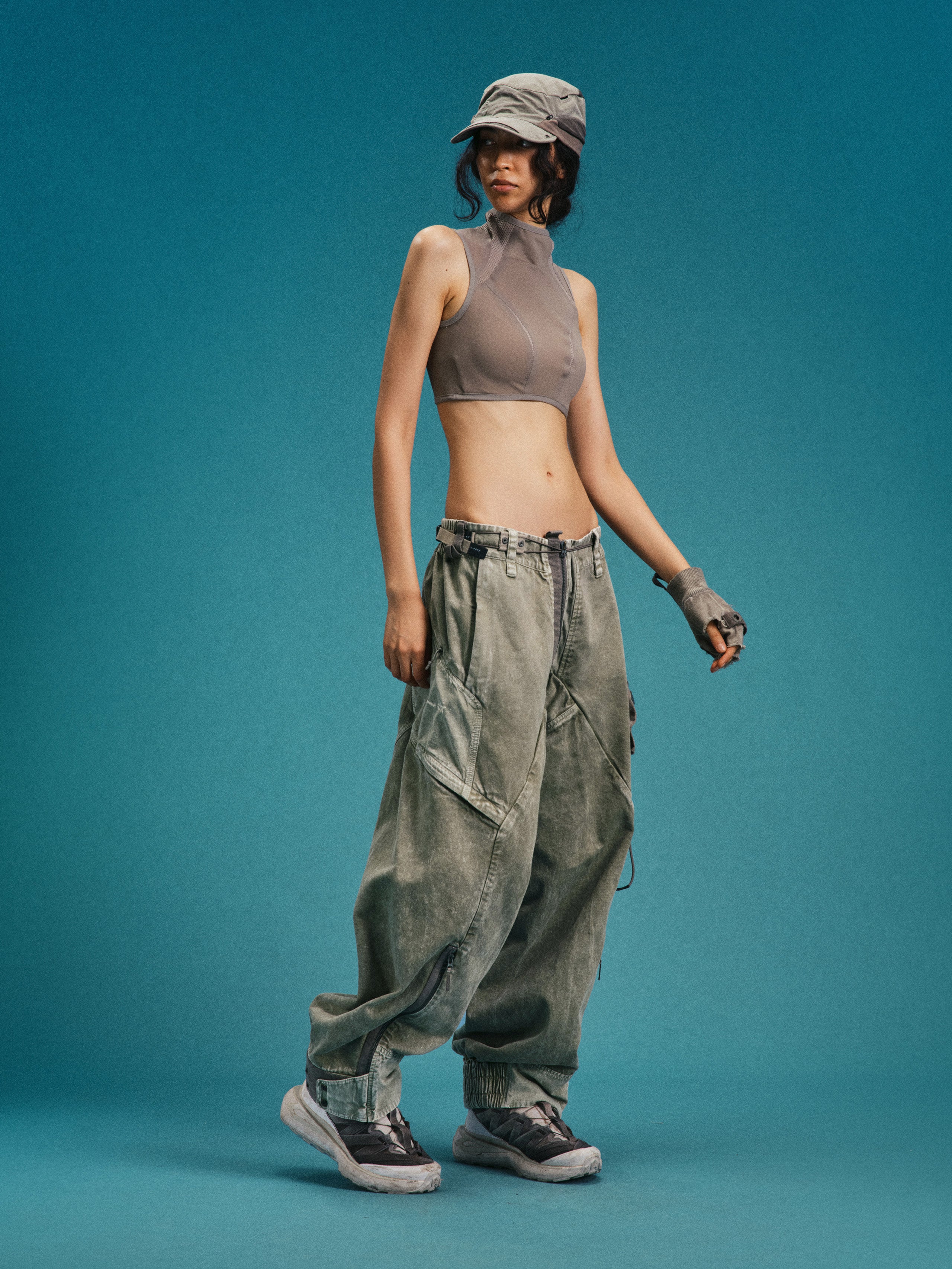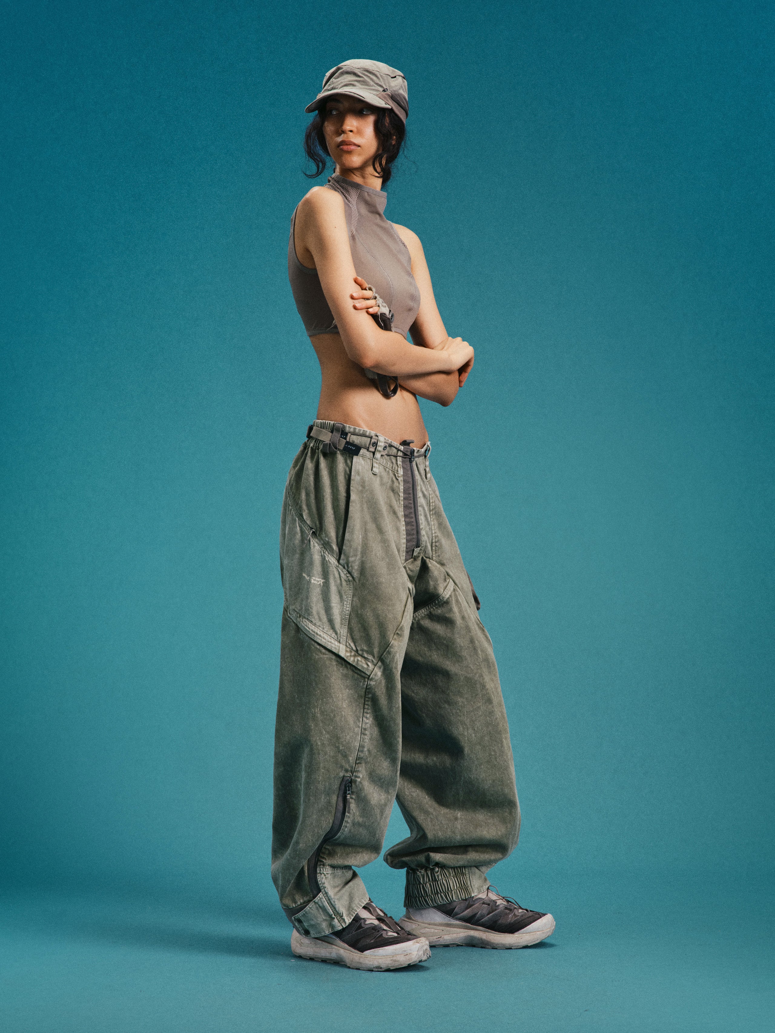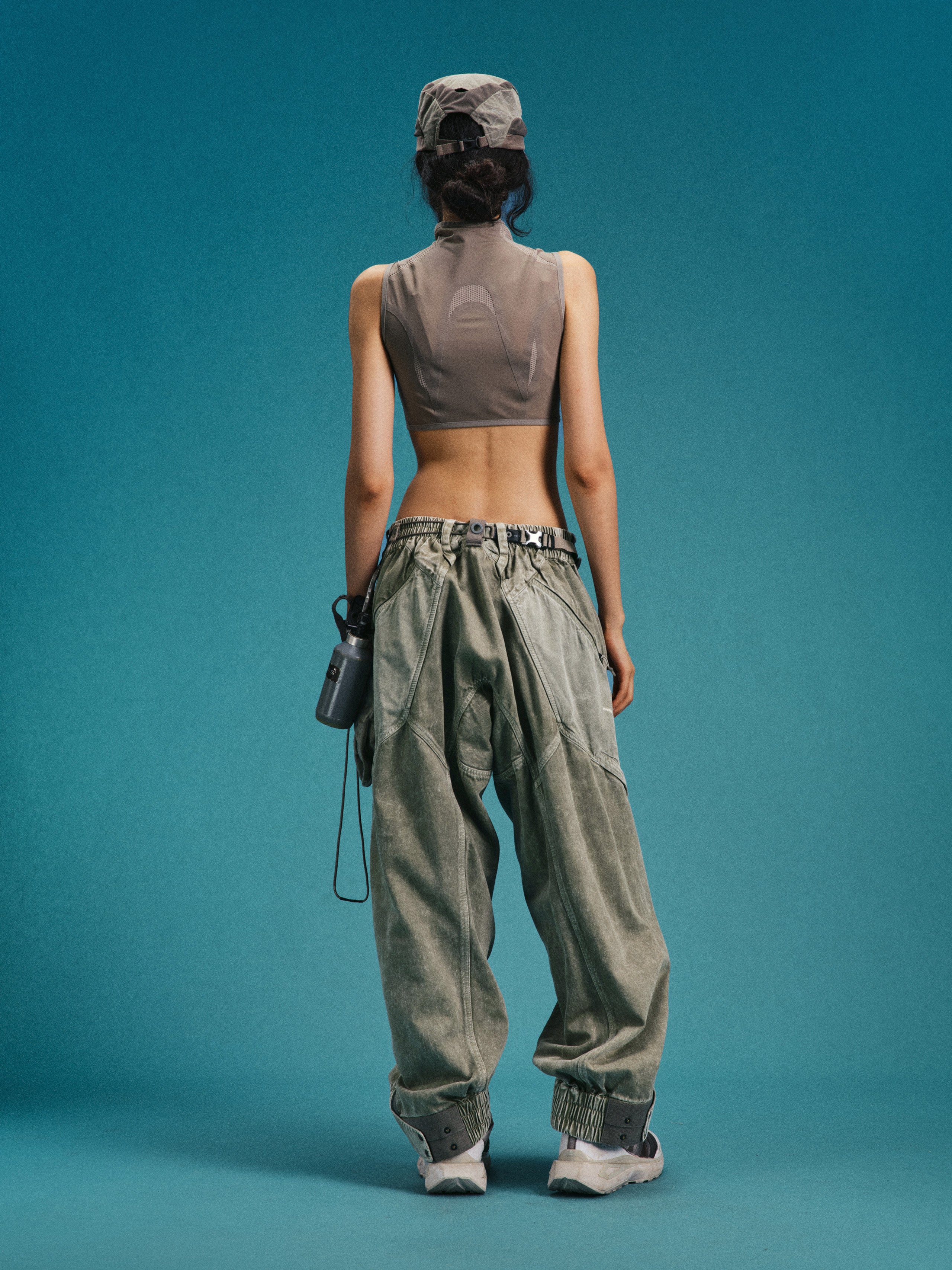 _Horizontal zippered pockets hidden under flaps on the outer thighs.