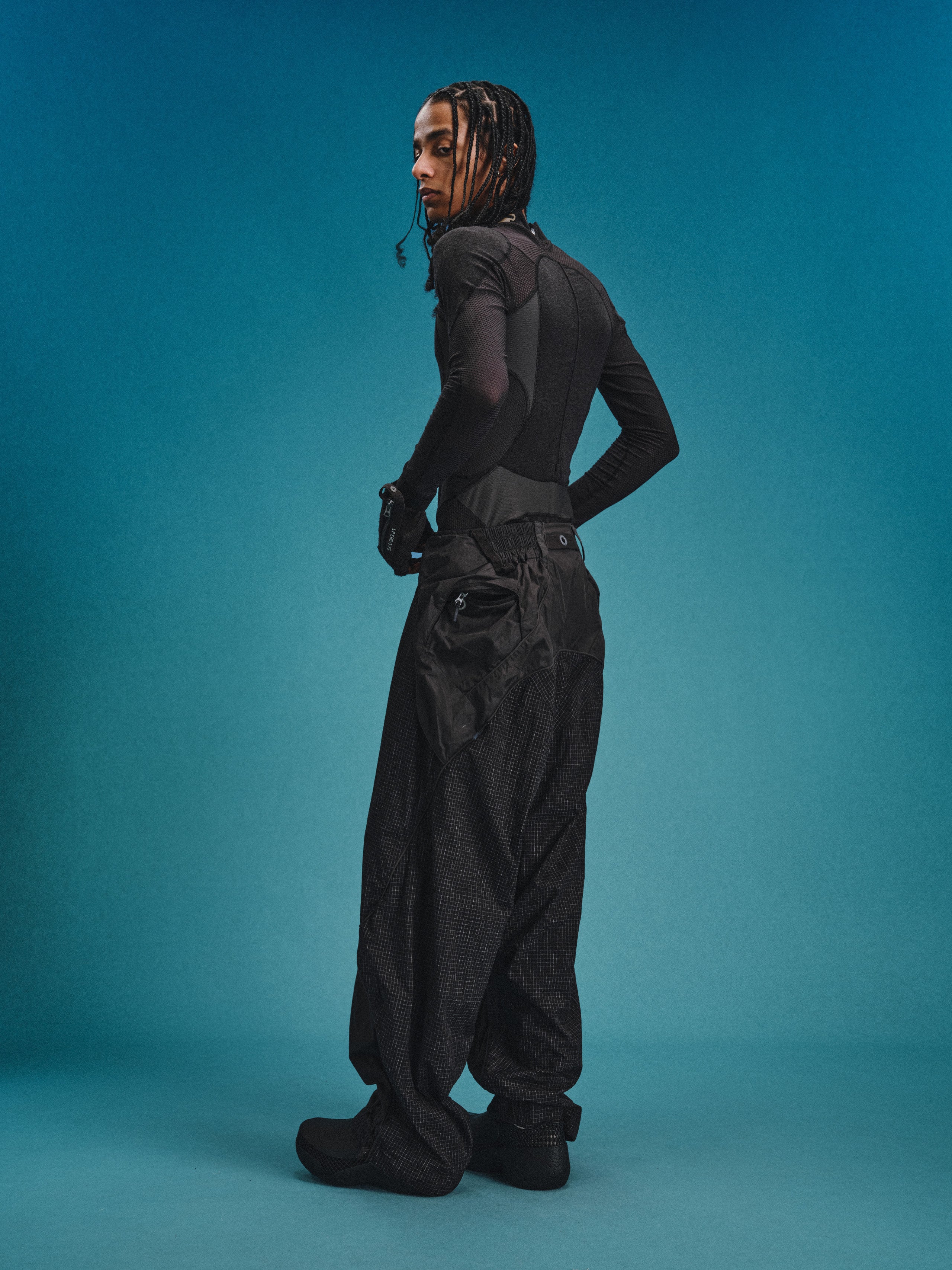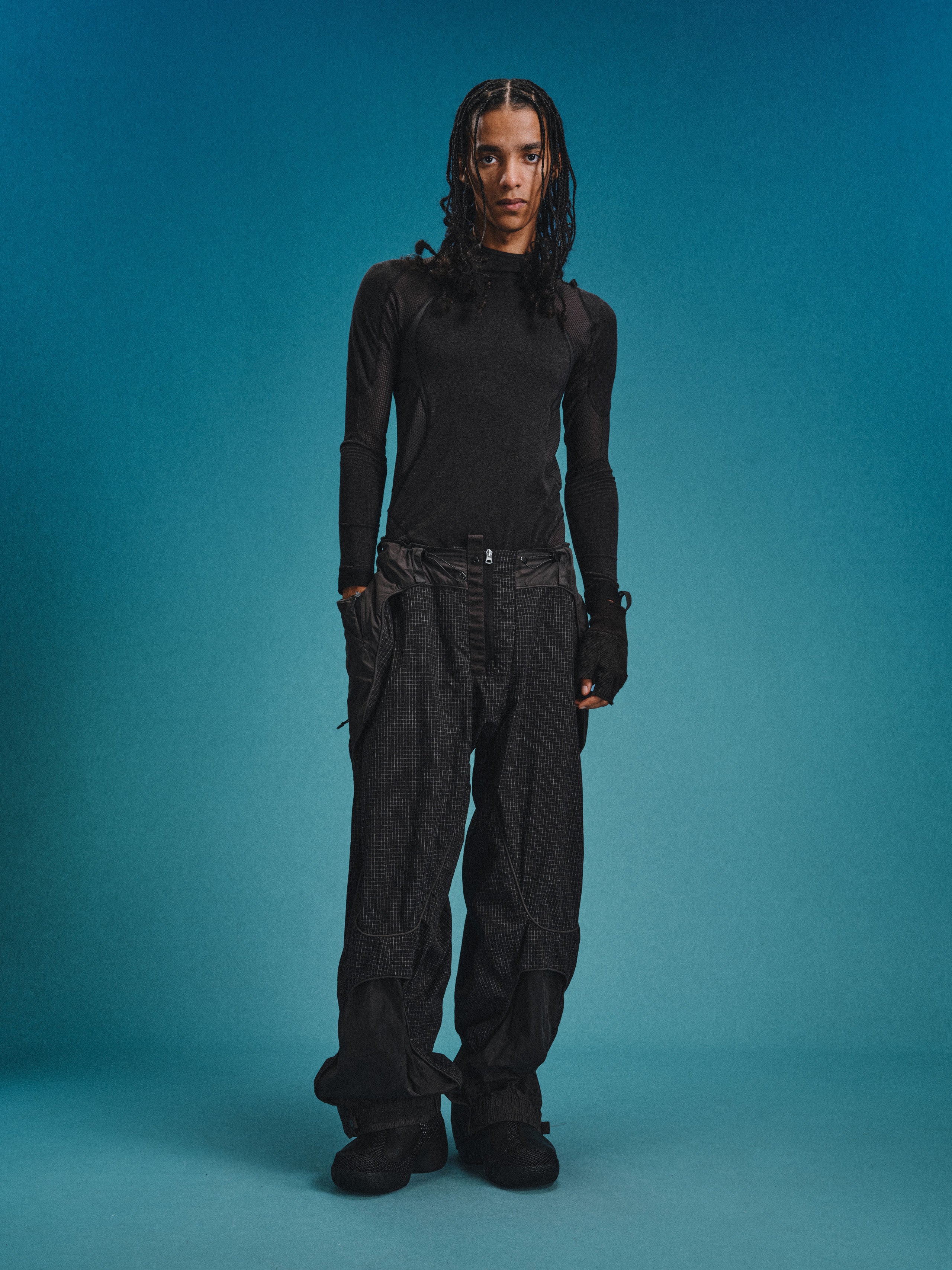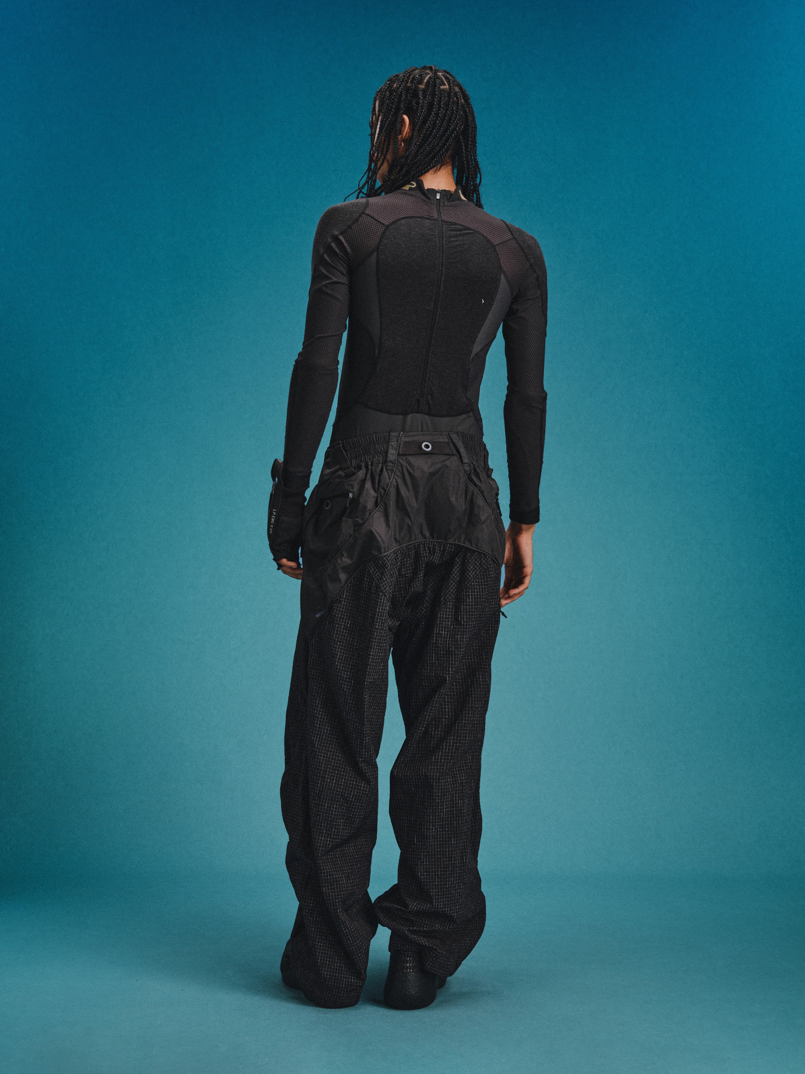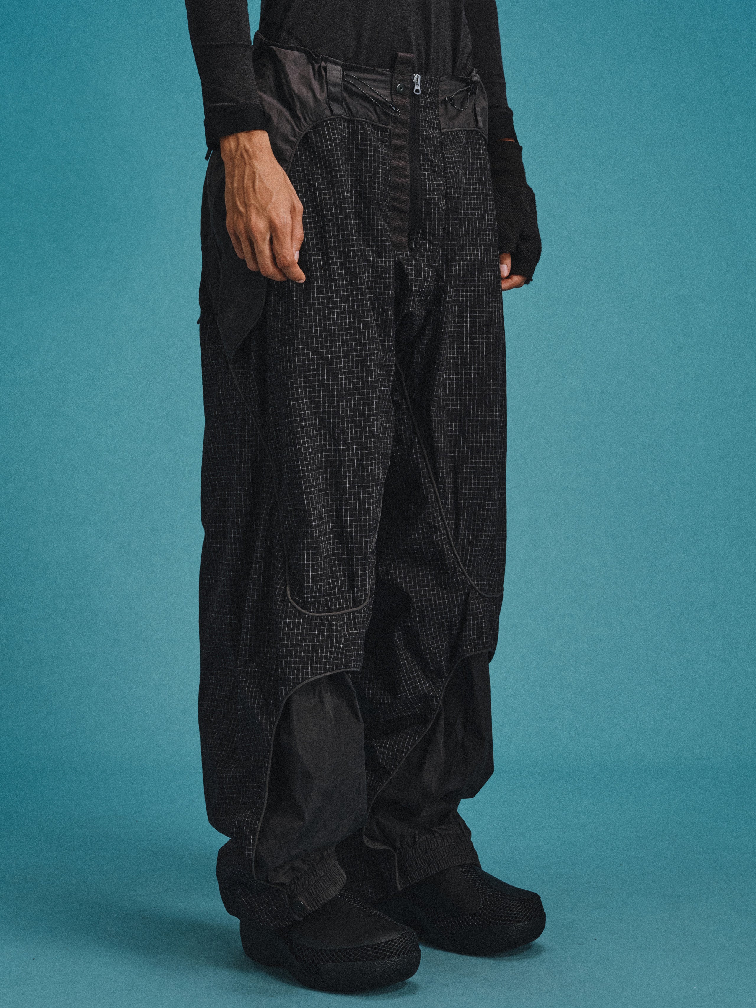 _Invisible zippered expandable structures on the inner and outer thighs, lined with high-density elastic mesh, suitable for ventilation and versatile styling.