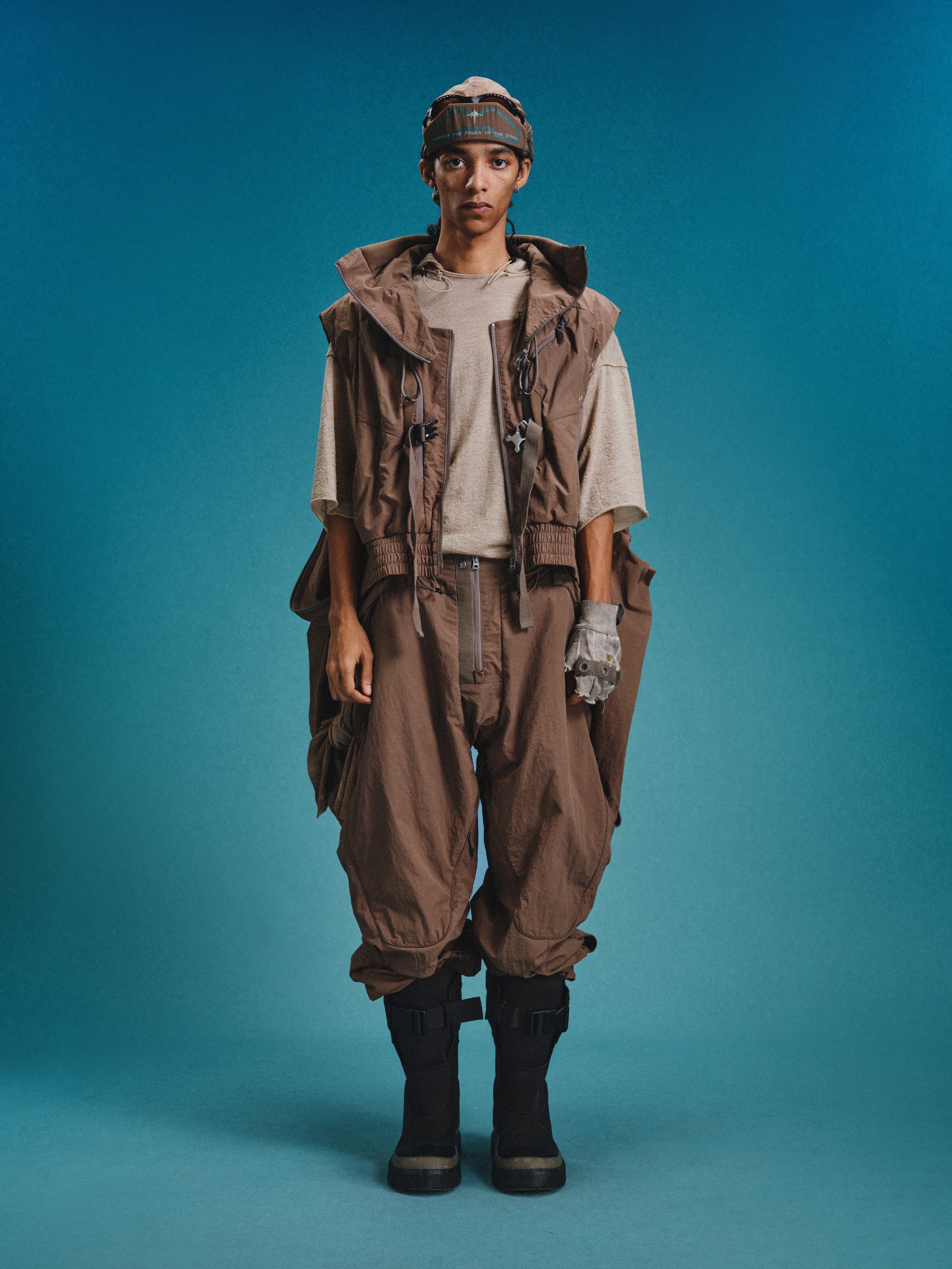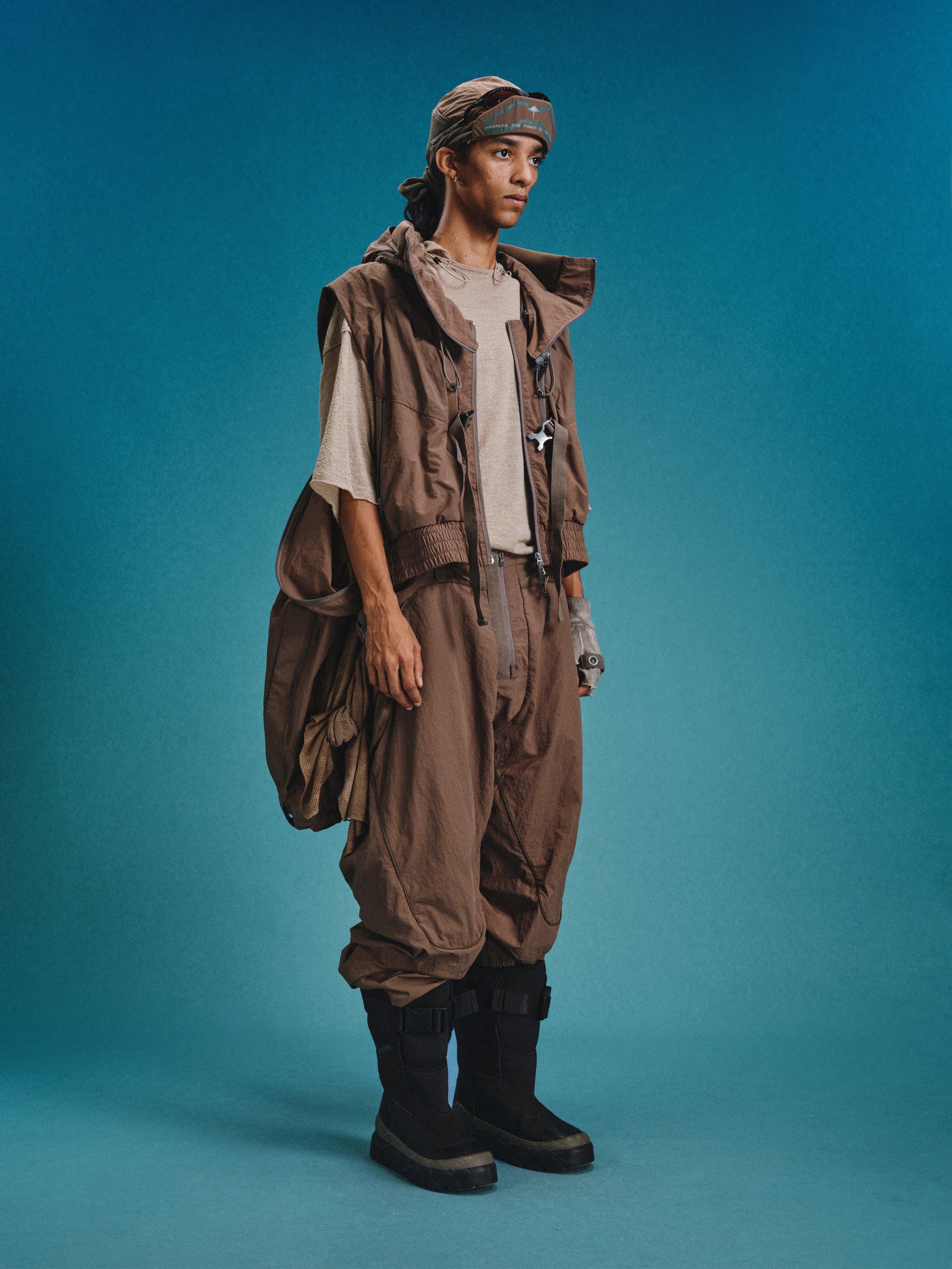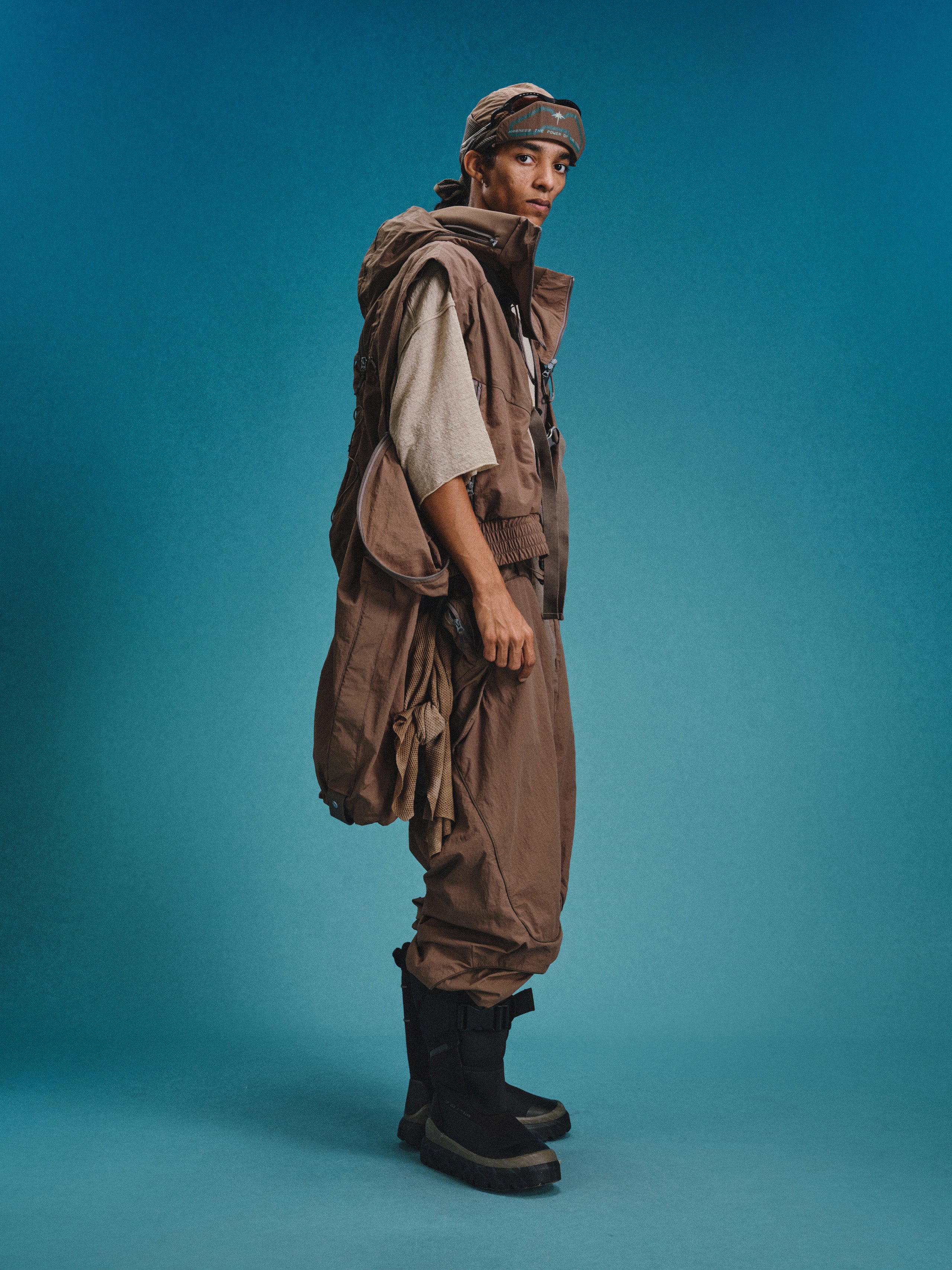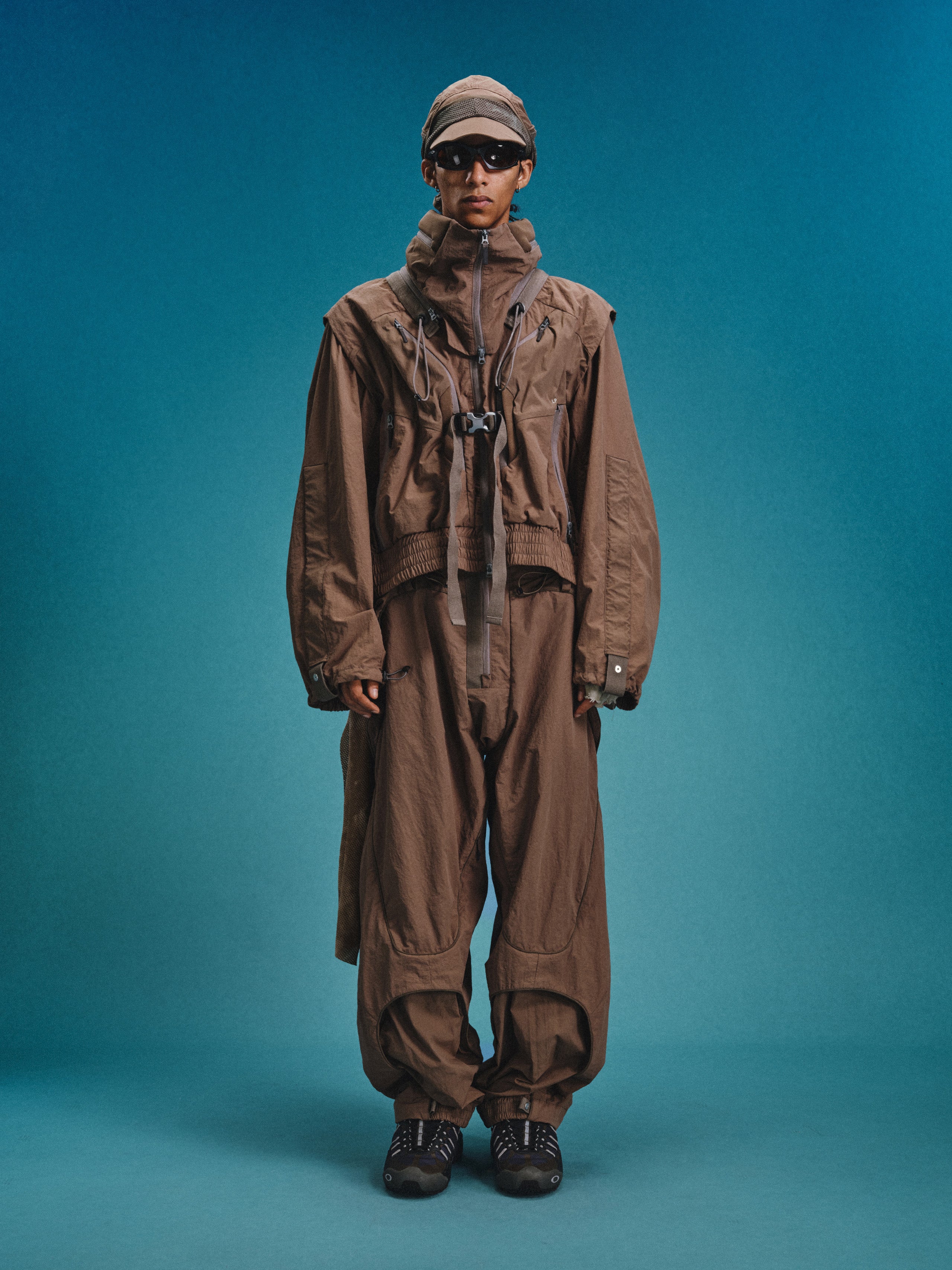 _Webbing strap snap adjustment at the leg openings.