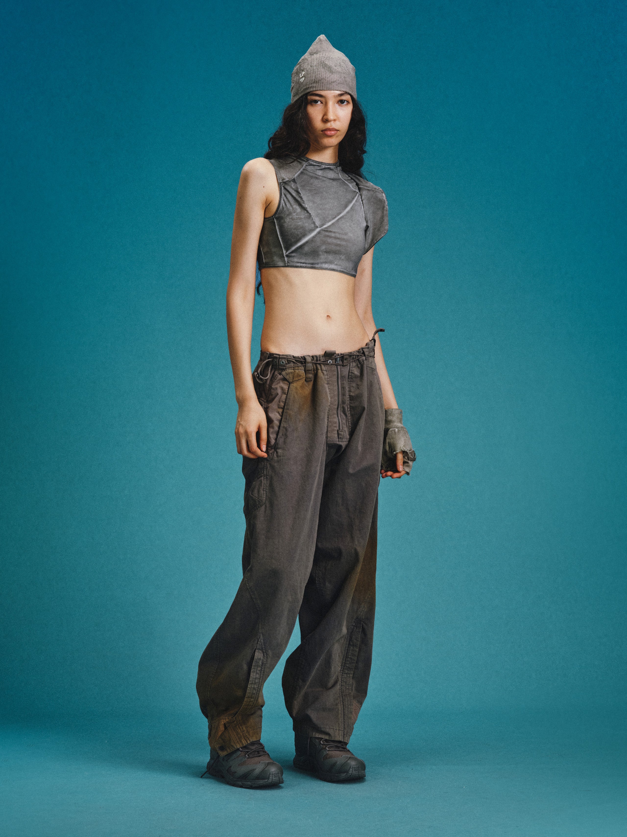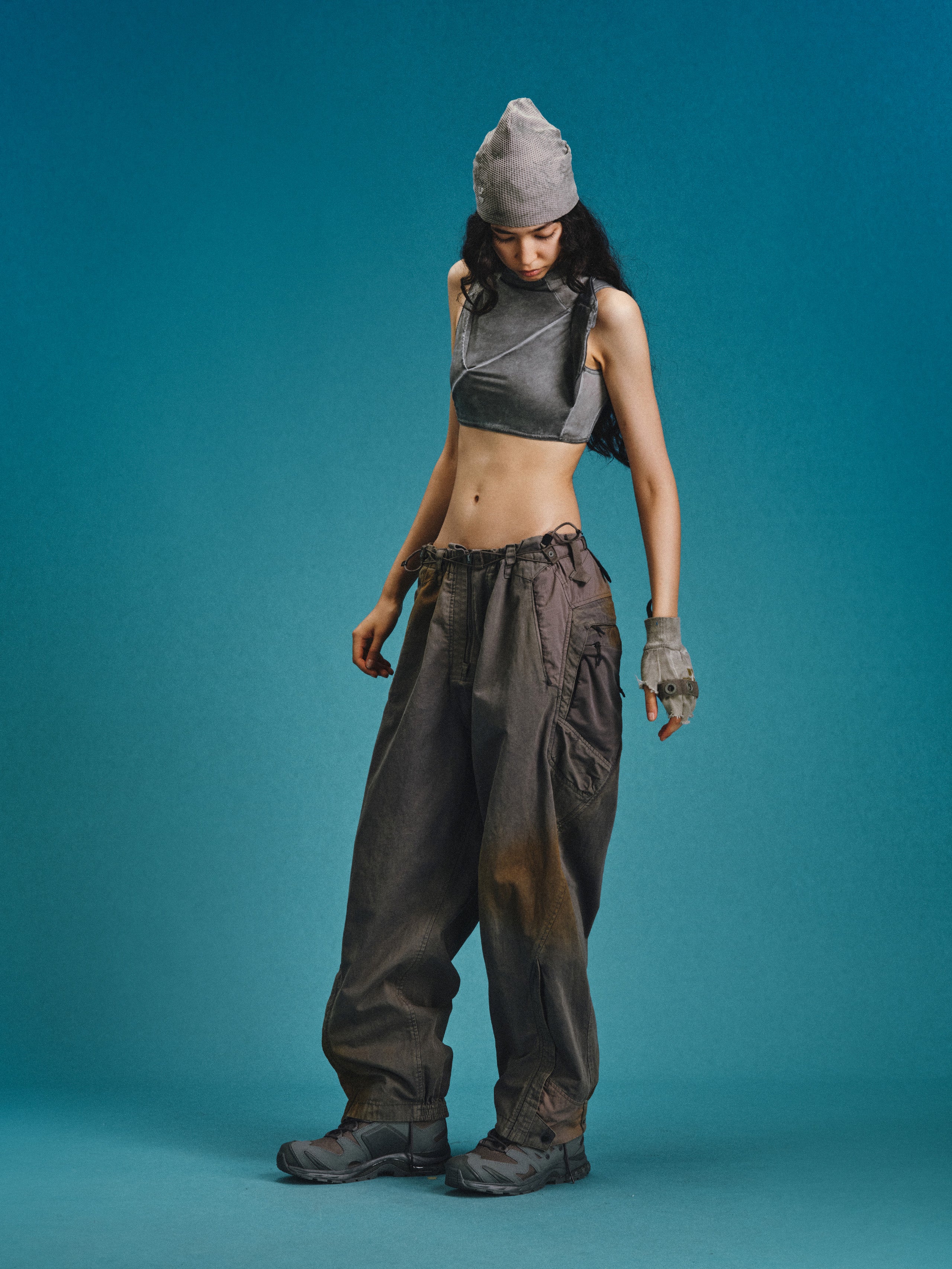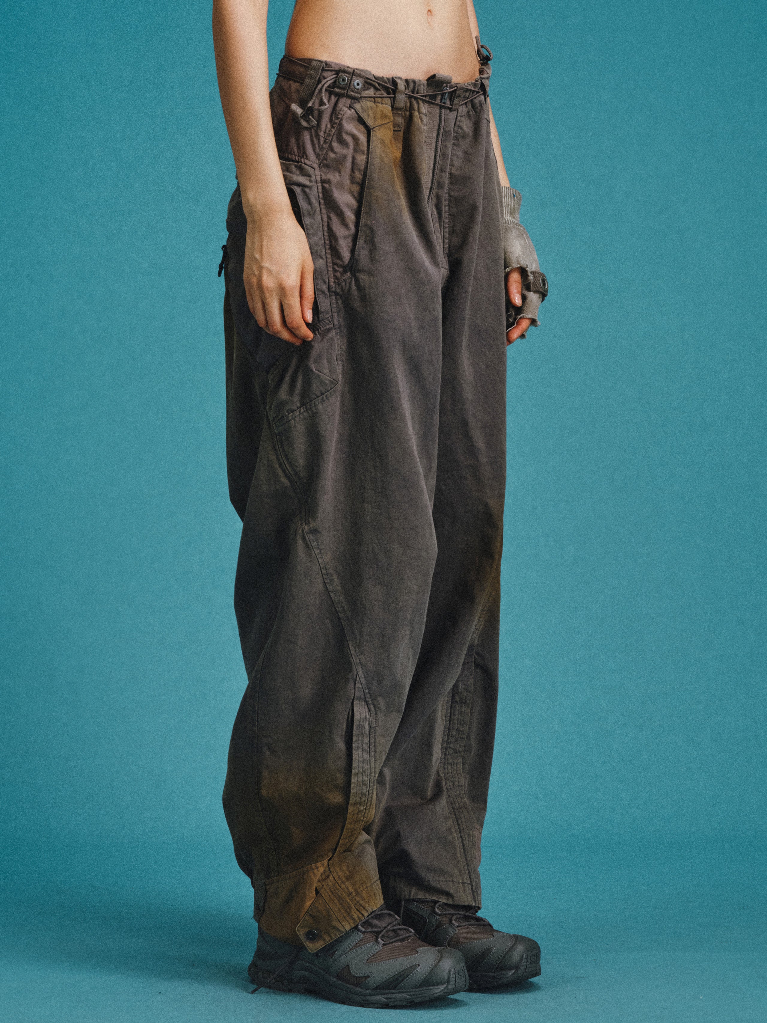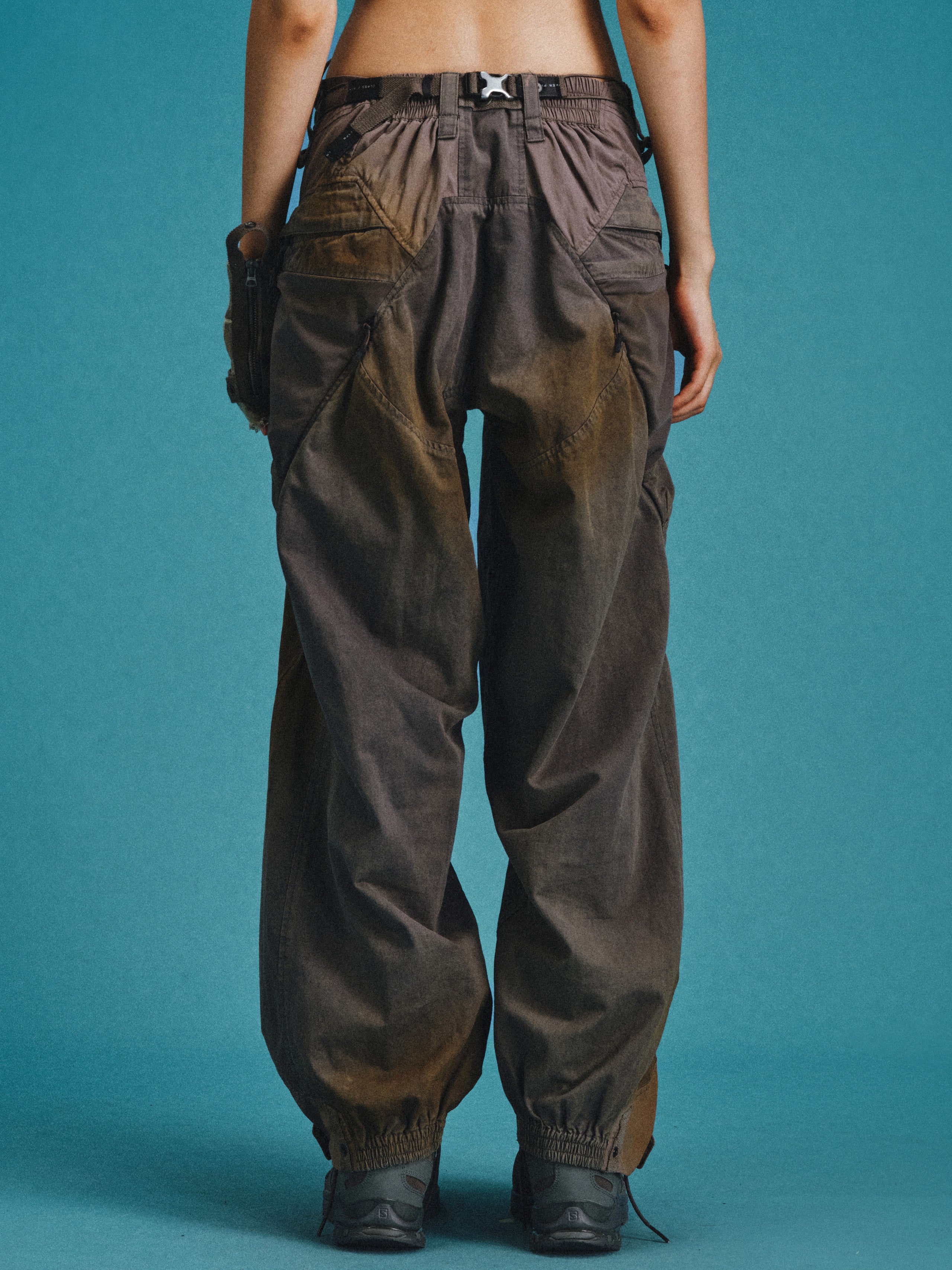 _Semi-structured layered cargo pockets at hips combine an upper concealed zippered pouch with a lower invisible-zippered mesh compartment for hybrid functionality.
