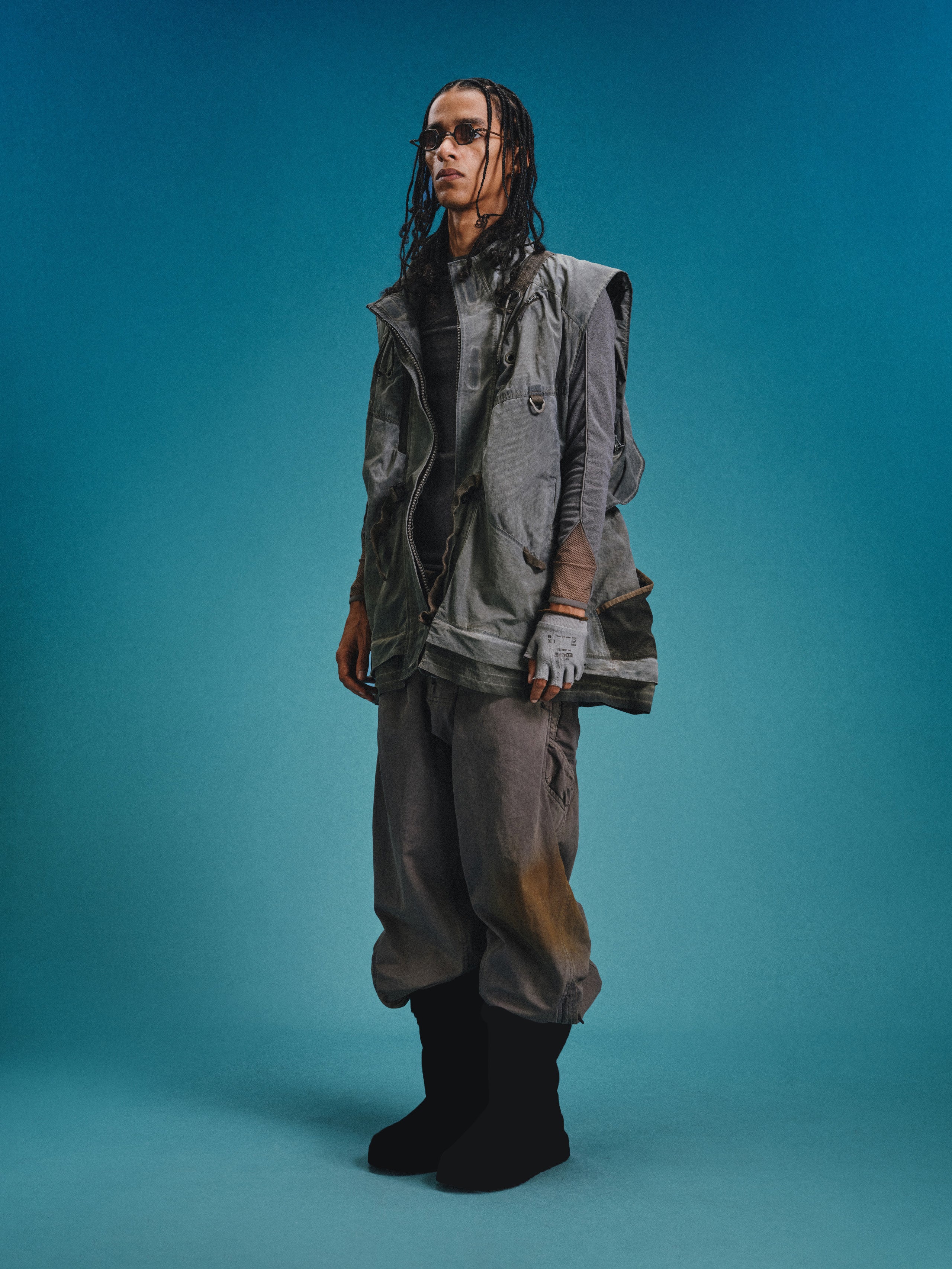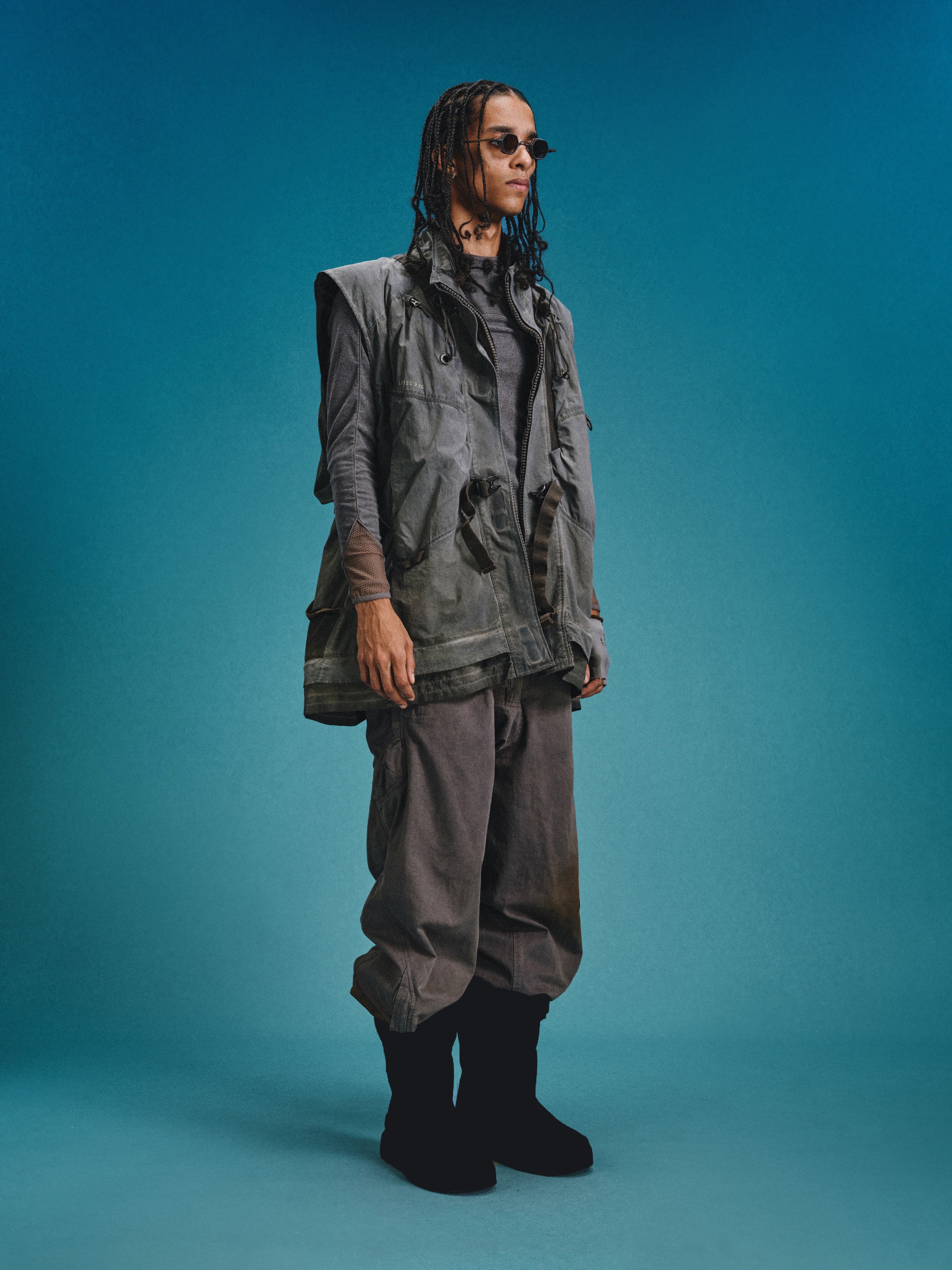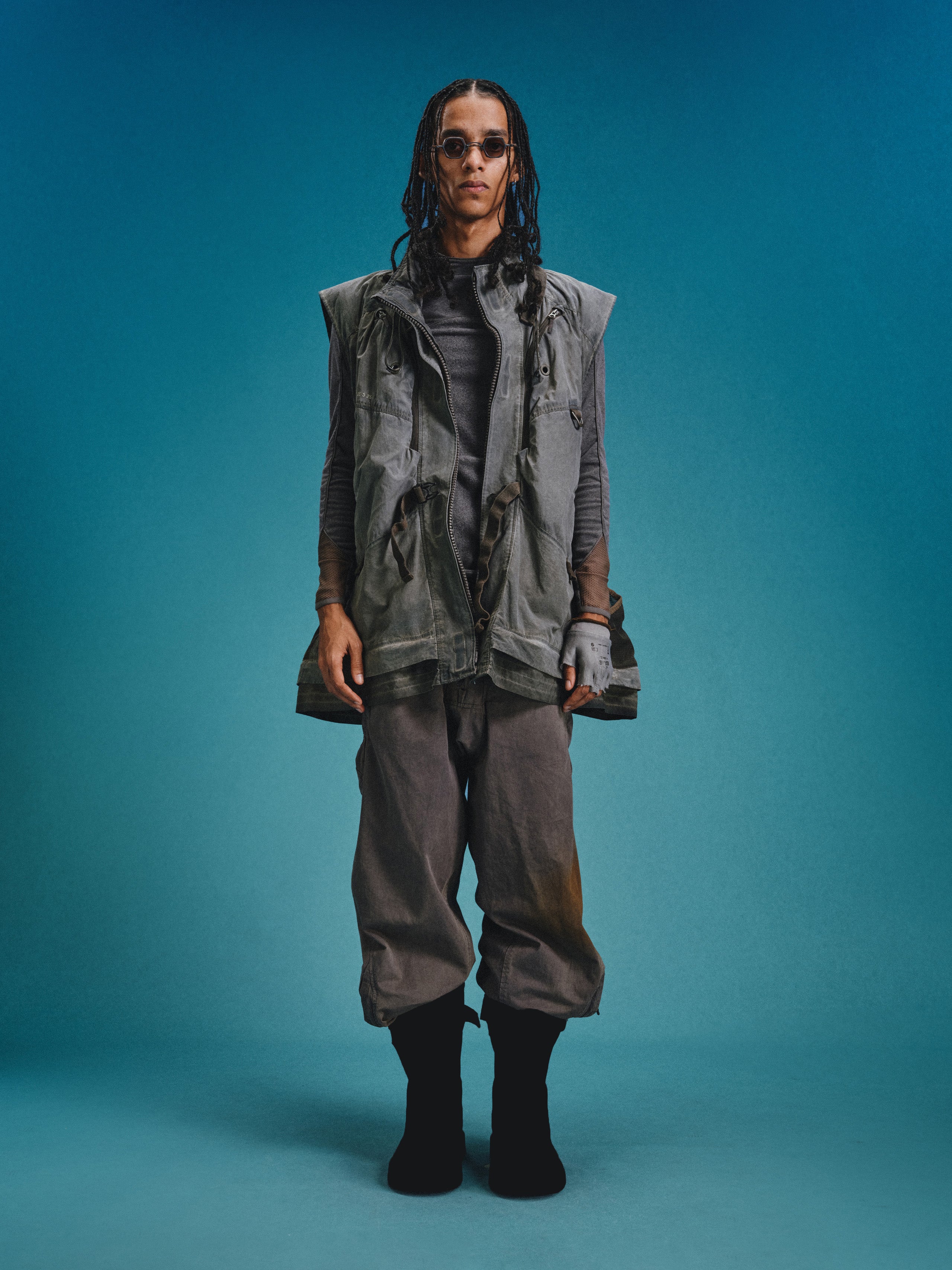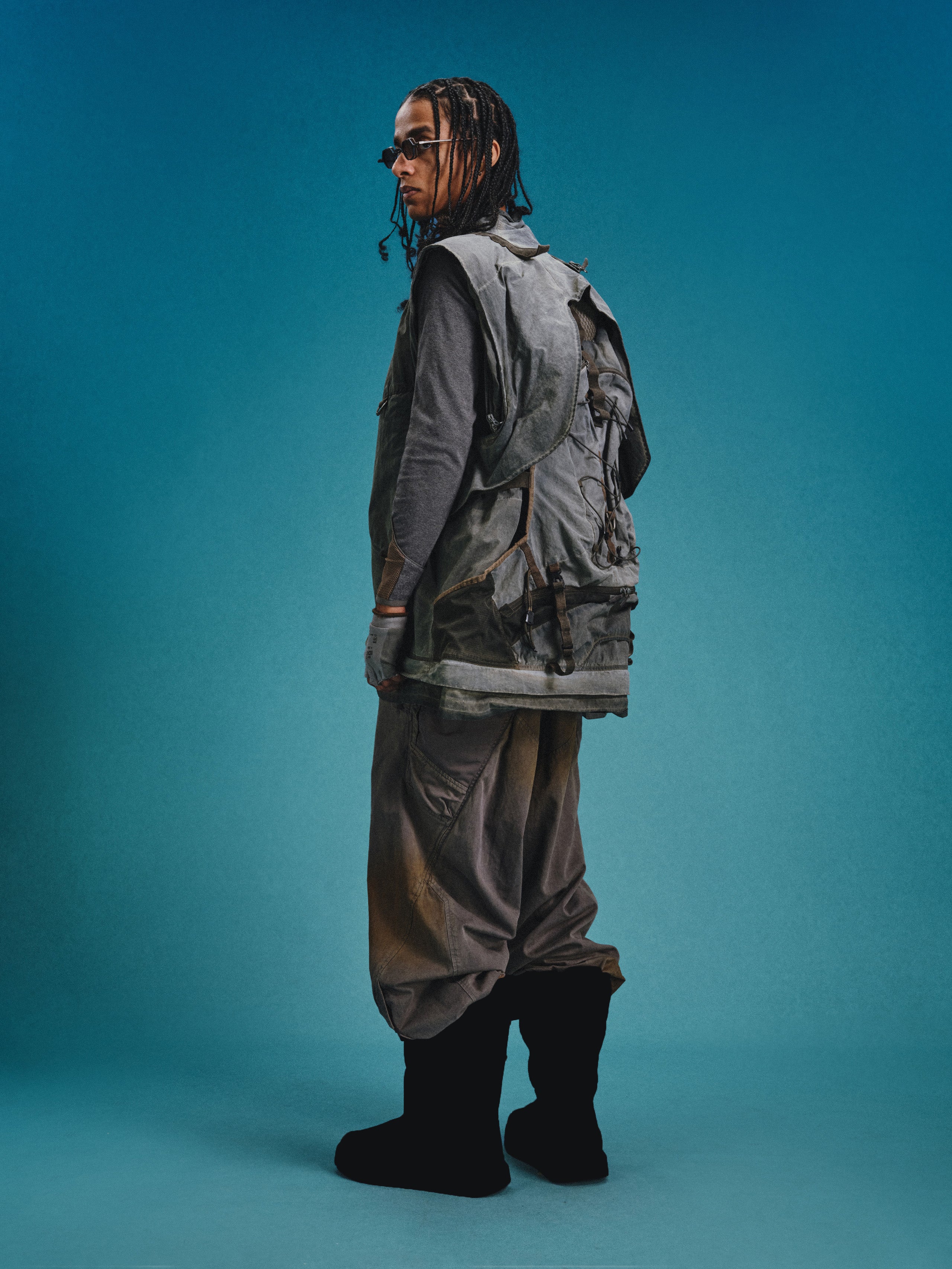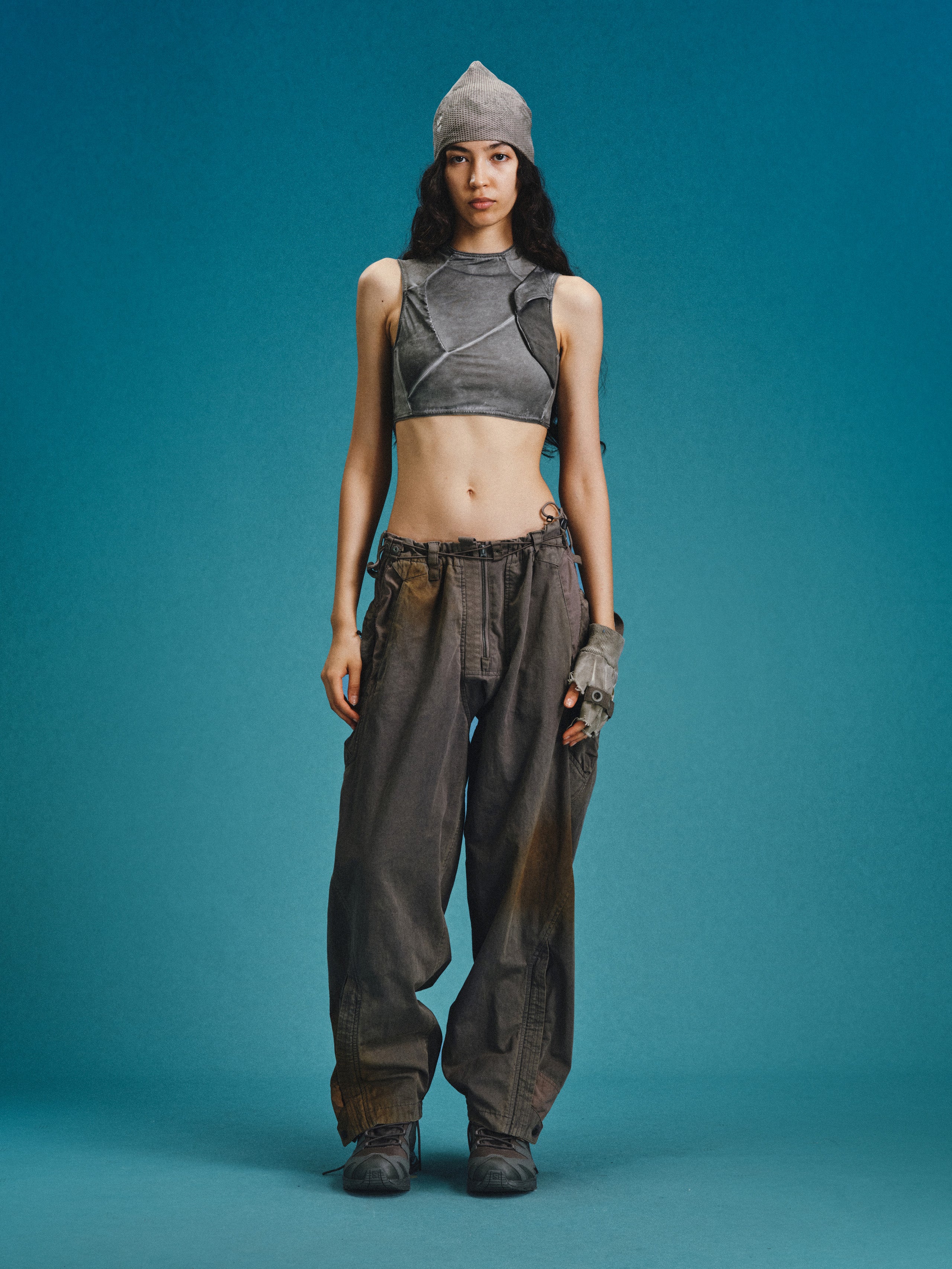 _Semi-structured layered cargo pockets at hips combine an upper concealed zippered pouch with a lower invisible-zippered mesh compartment for hybrid functionality.
