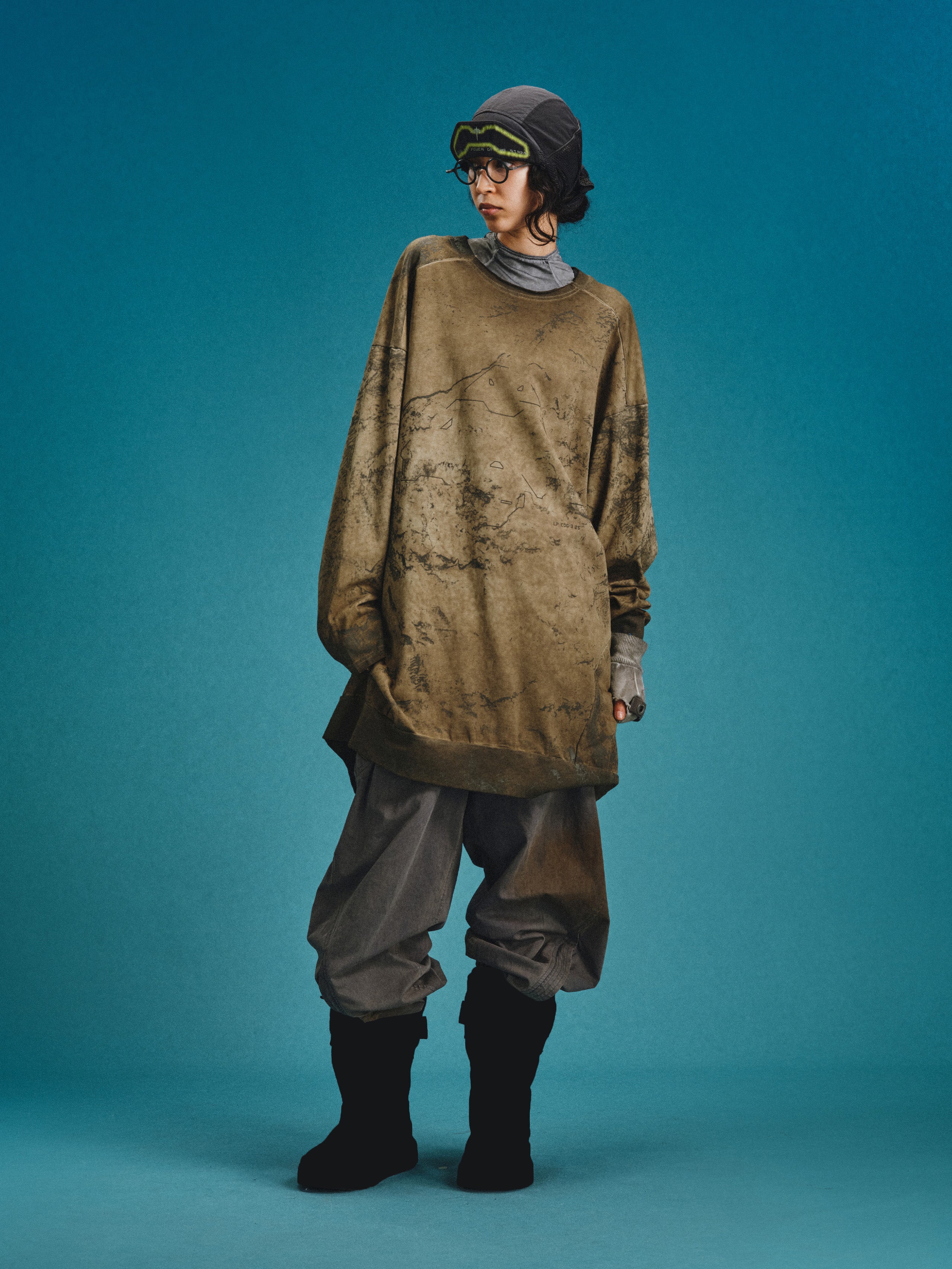 _Industrial stain-dyed finish, random pigment residues on fabric.