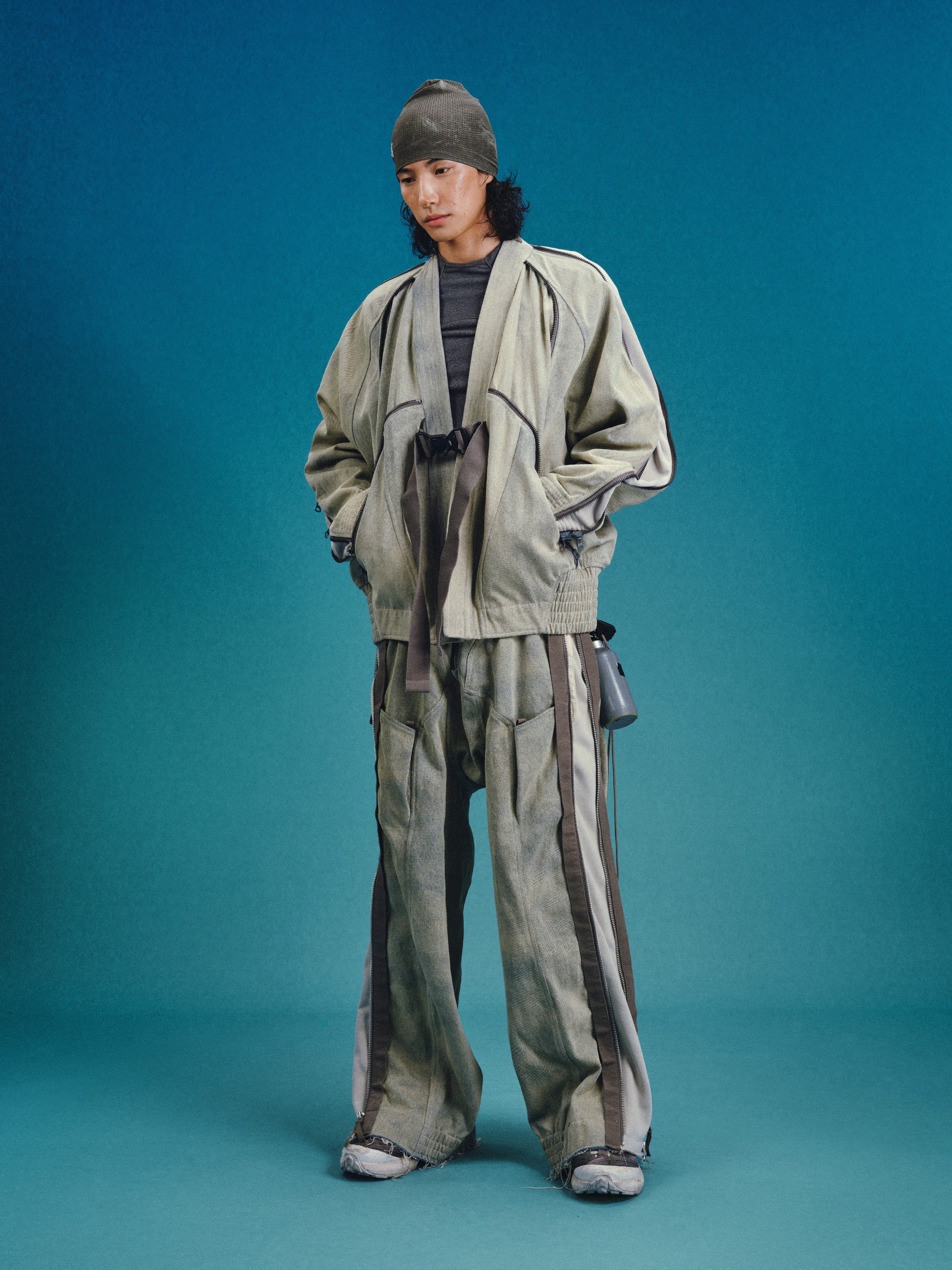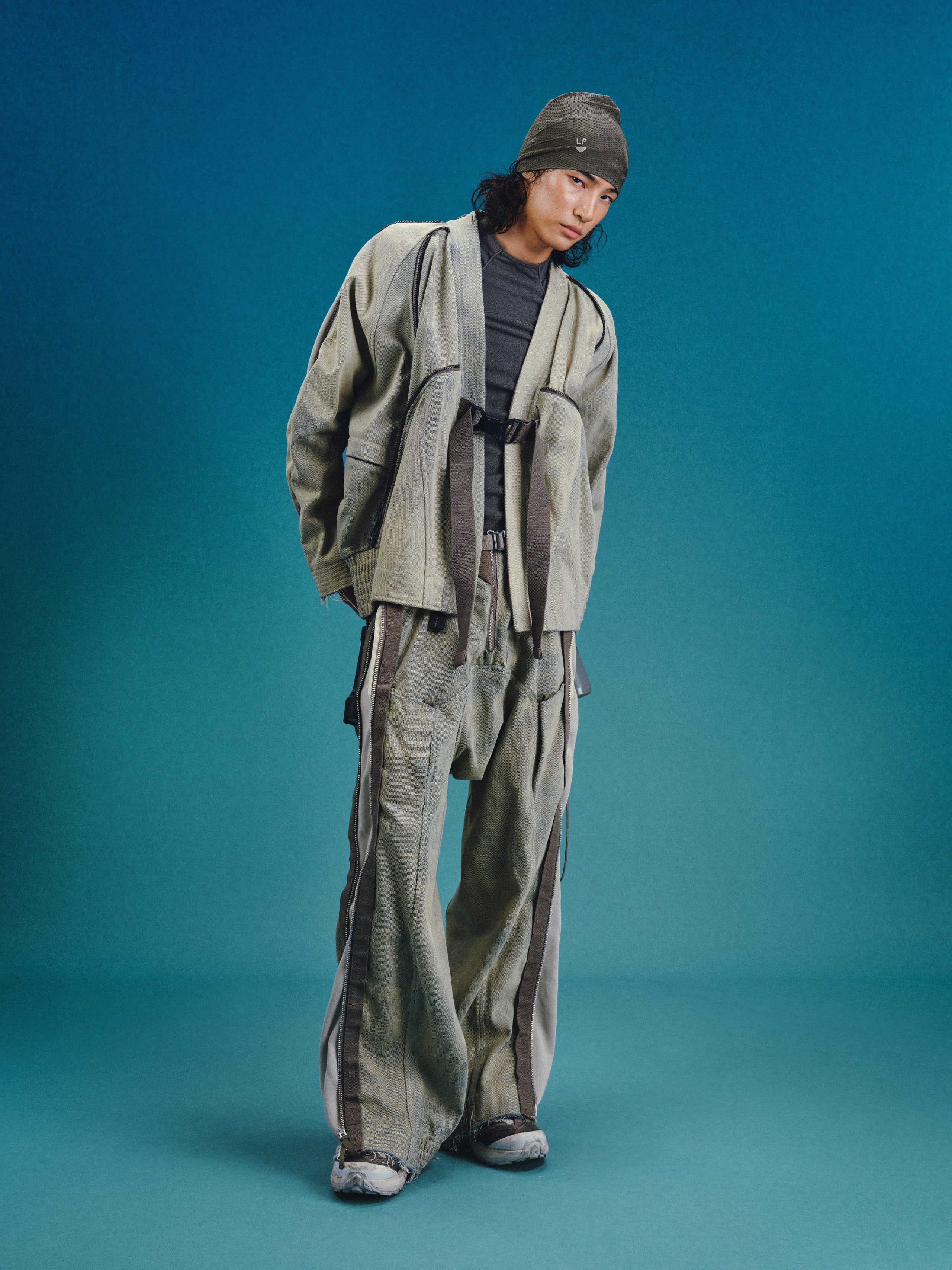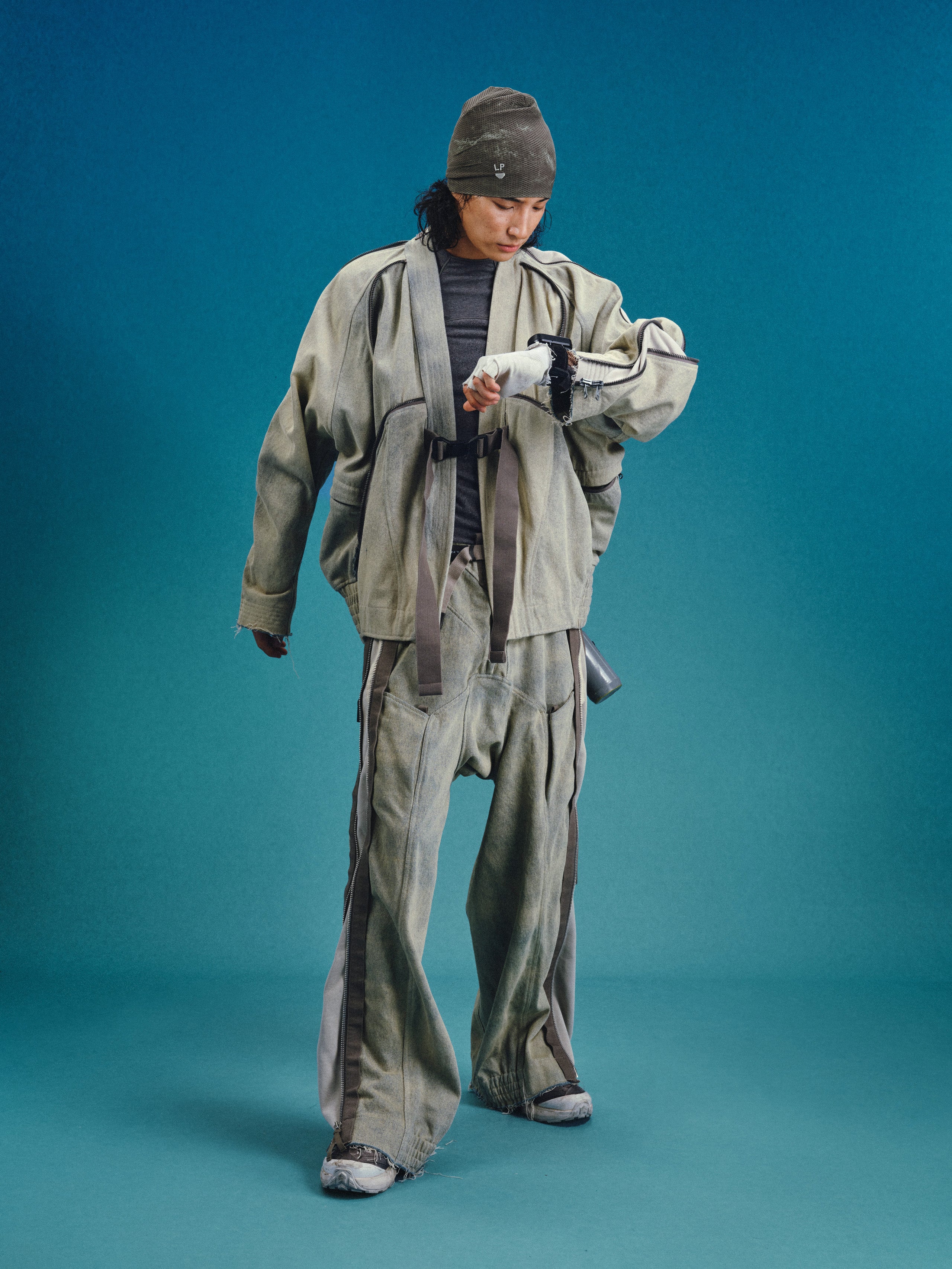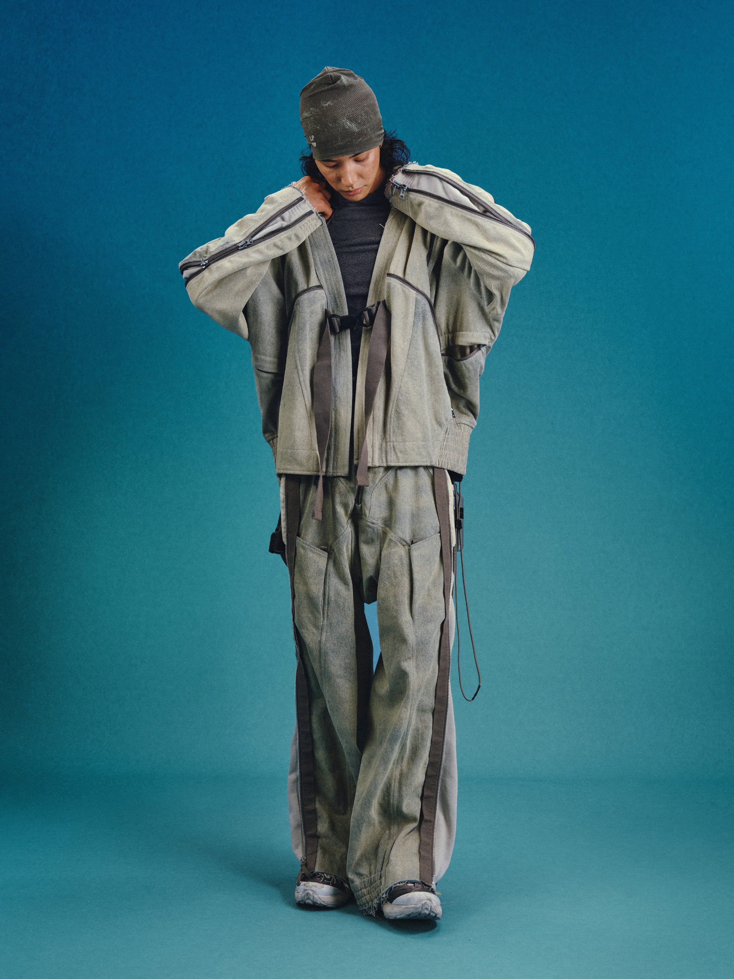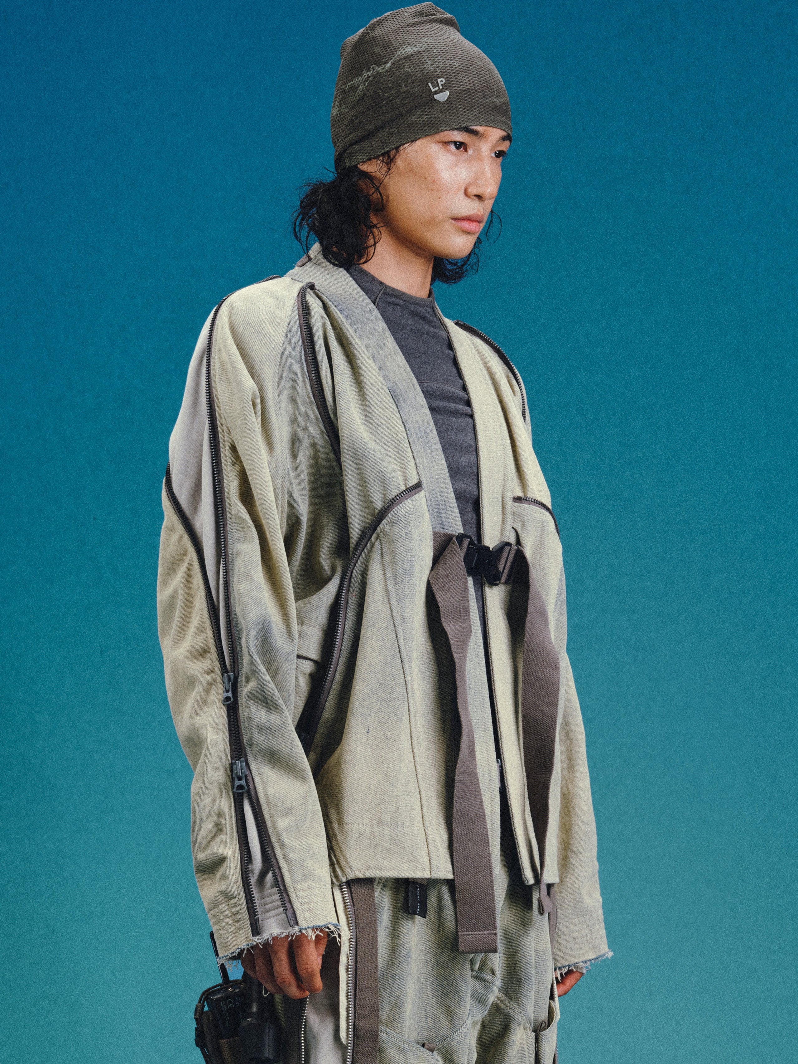 _Drop-shoulder kimono-style jacket with six heavy-duty zippers distributed across the front, sleeve sides, and back; each zipper allows for cinching and opening to adjust the silhouette.