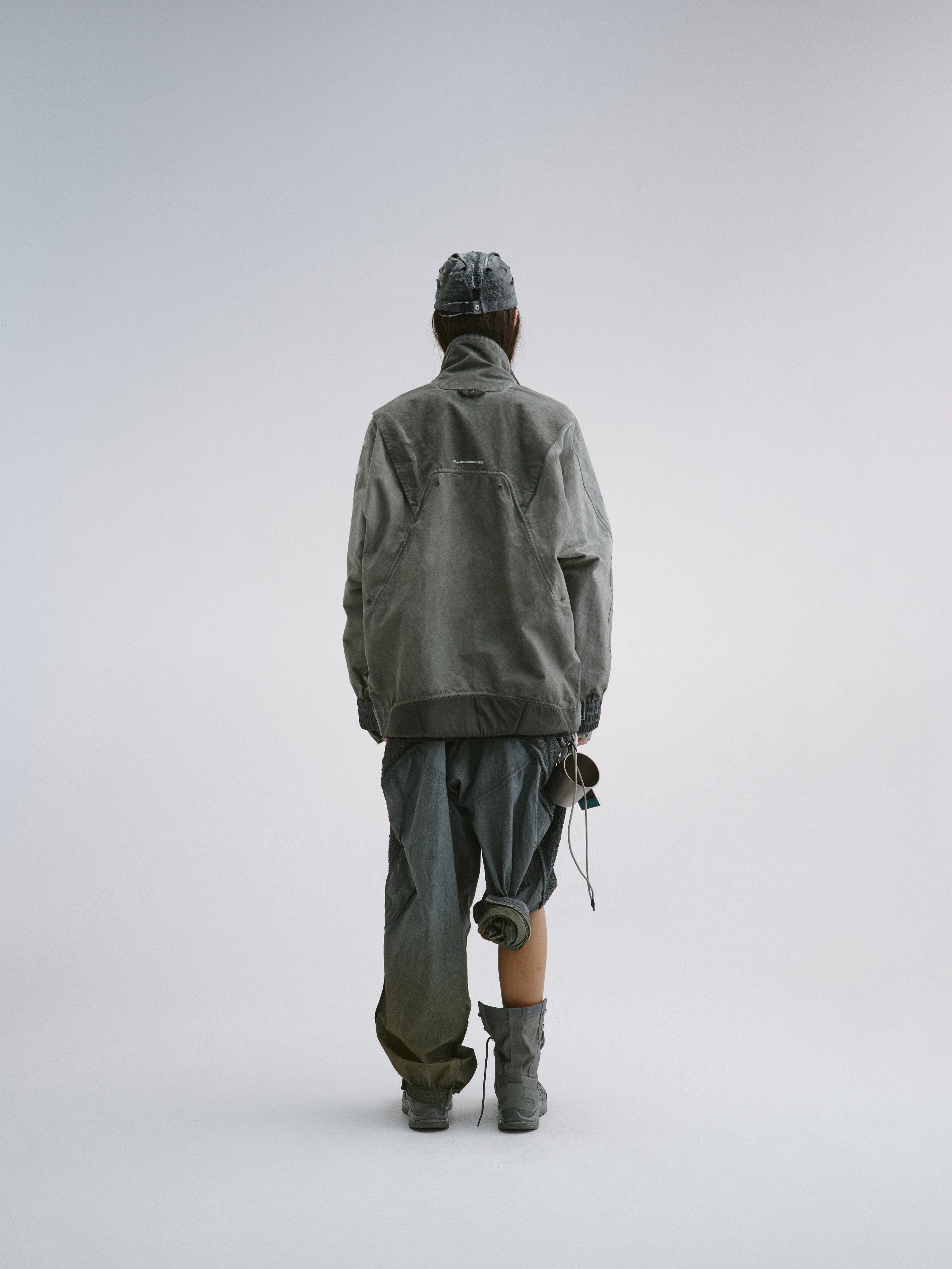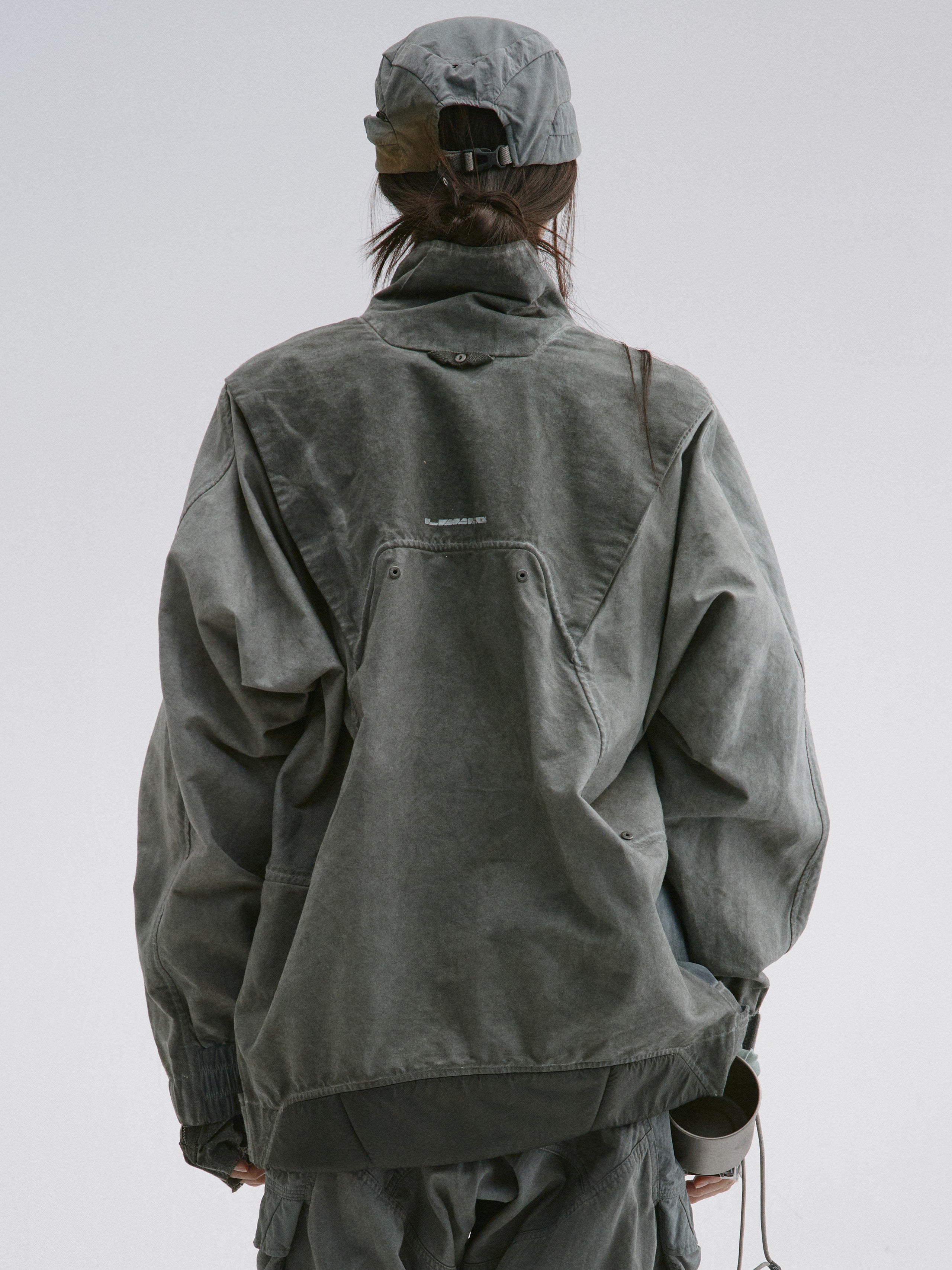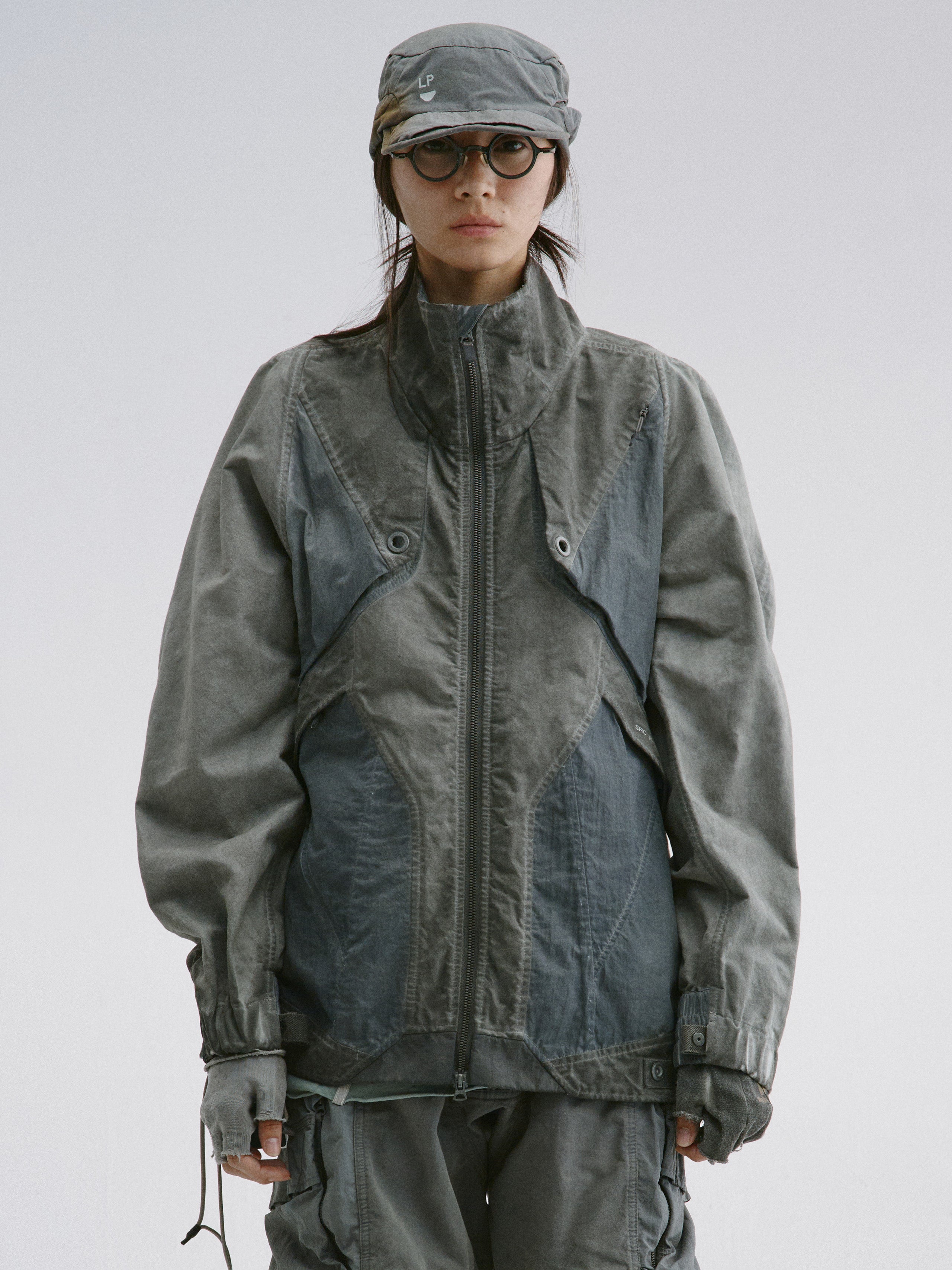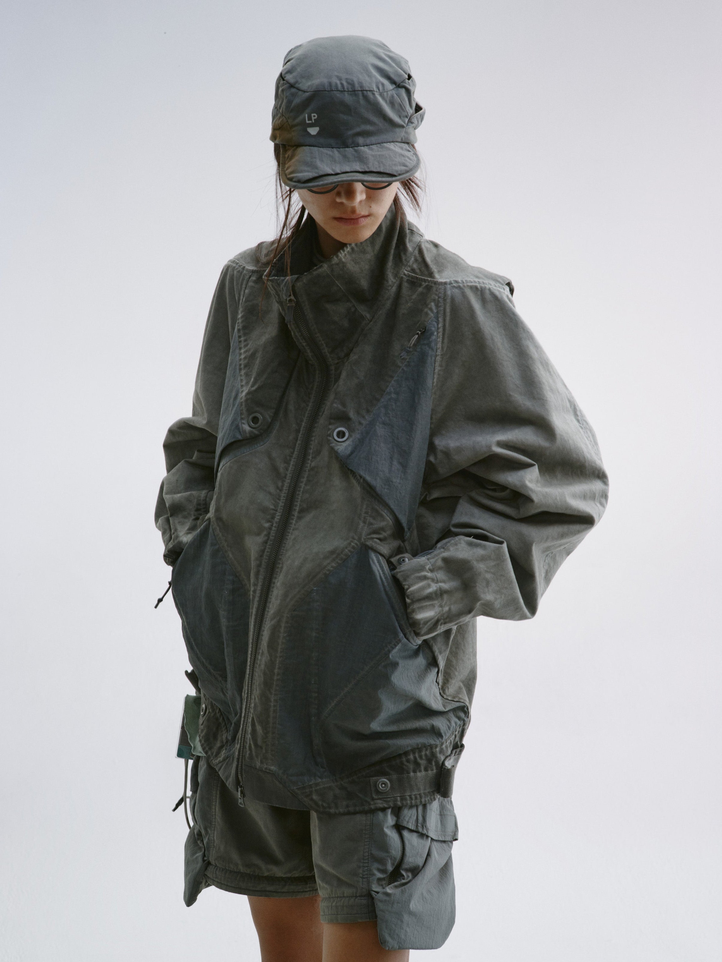 _Dual-way zipper closure on the front placket, extending up to the collar.